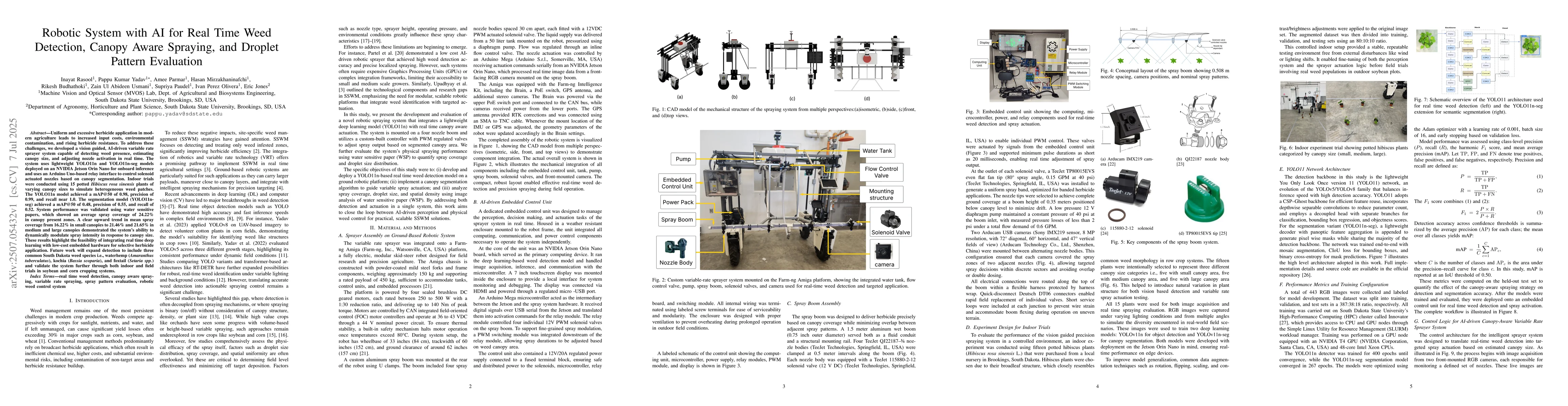 Uniform and excessive herbicide application in modern agriculture contributes to increased input costs, environmental pollution, and the emergence of herbicide resistant weeds. To address these challenges, we developed a vision guided, AI-driven variable rate sprayer system capable of detecting weed presence, estimating canopy size, and dynamically adjusting nozzle activation in real time. The system integrates lightweight YOLO11n and YOLO11n-seg deep learning models, deployed on an NVIDIA Jetson Orin Nano for onboard inference, and uses an Arduino Uno-based relay interface to control solenoid actuated nozzles based on canopy segmentation results. Indoor trials were conducted using 15 potted Hibiscus rosa sinensis plants of varying canopy sizes to simulate a range of weed patch scenarios. The YOLO11n model achieved a mean average precision (mAP@50) of 0.98, with a precision of 0.99 and a recall close to 1.0. The YOLO11n-seg segmentation model achieved a mAP@50 of 0.48, precision of 0.55, and recall of 0.52. System performance was validated using water sensitive paper, which showed an average spray coverage of 24.22% in zones where canopy was present. An upward trend in mean spray coverage from 16.22% for small canopies to 21.46% and 21.65% for medium and large canopies, respectively, demonstrated the system's capability to adjust spray output based on canopy size in real time. These results highlight the potential of combining real time deep learning with low-cost embedded hardware for selective herbicide application. Future work will focus on expanding the detection capabilities to include three common weed species in South Dakota: water hemp (Amaranthus tuberculatus), kochia (Bassia scoparia), and foxtail (Setaria spp.), followed by further validation in both indoor and field trials within soybean and corn production systems.