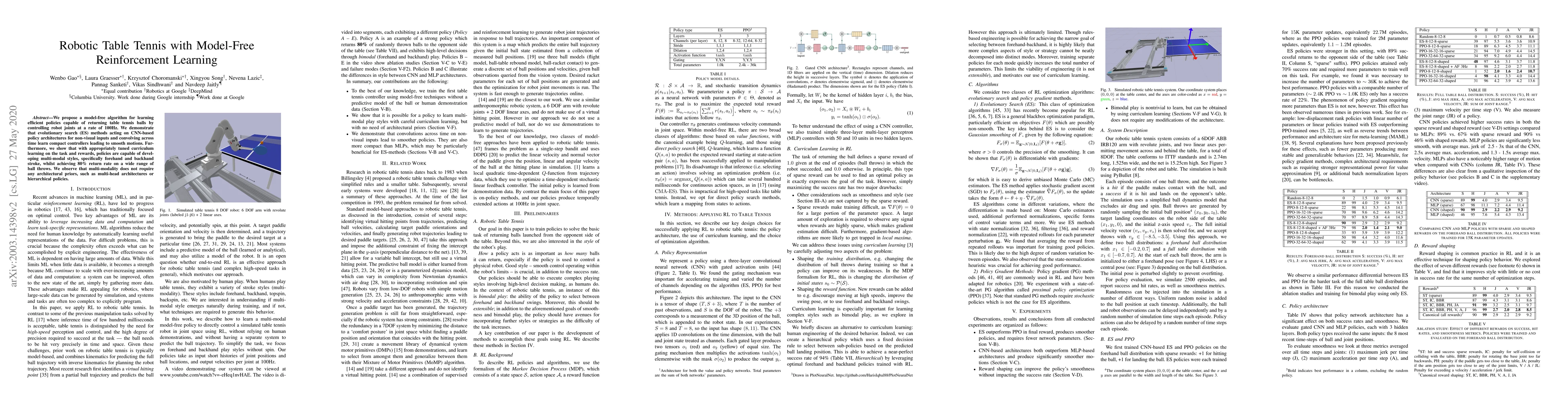 This paper presents a model-free reinforcement learning approach using evolutionary search on CNN-based policies to control a robotic table tennis player, achieving an 80% return rate on varied ball throws. The method demonstrates the development of multi-modal playing styles without requiring complex architectures.