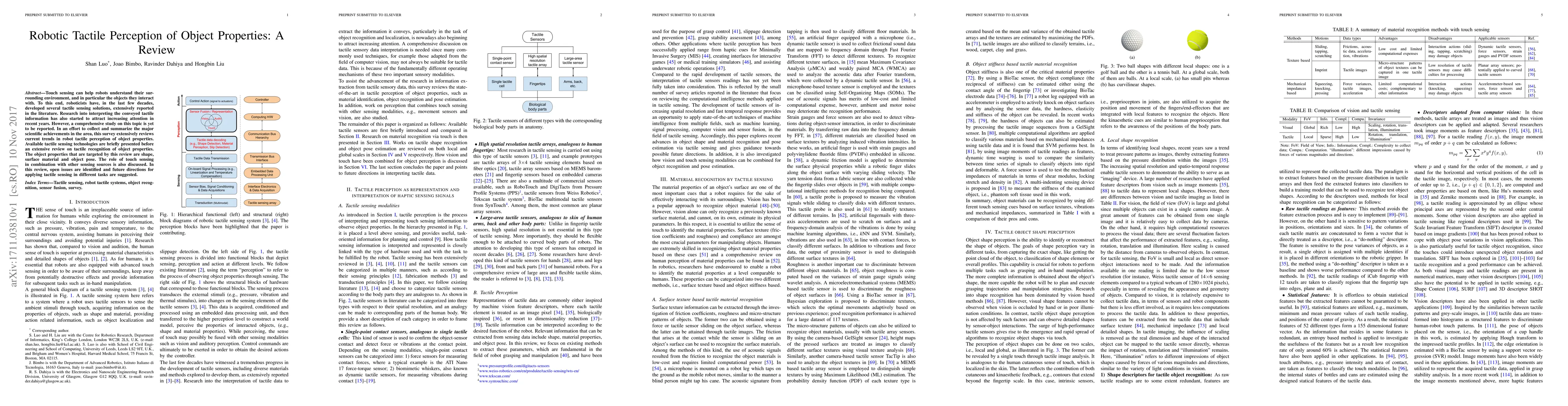 This paper reviews advancements in robotic tactile perception technologies for identifying object properties, focusing on shape, surface material, and pose, and discusses the integration of tactile sensing with other modalities. It highlights current trends, open issues, and future directions for tactile sensing applications.