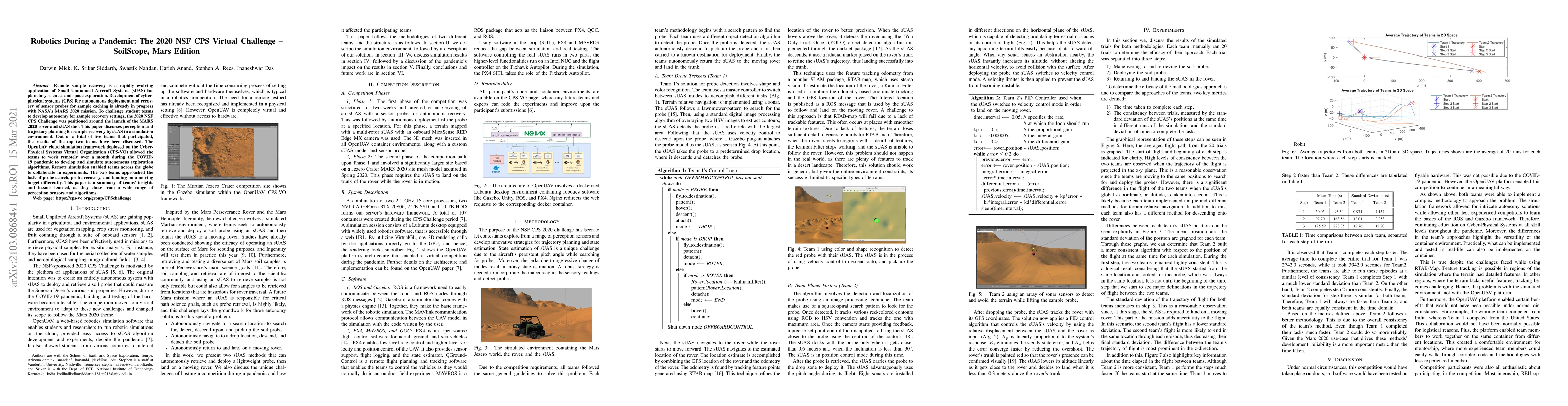Remote sample recovery is a rapidly evolving application of Small Unmanned Aircraft Systems (sUAS) for planetary sciences and space exploration. Development of cyber-physical systems (CPS) for autonomous deployment and recovery of sensor probes for sample caching is already in progress with NASA's MARS 2020 mission. To challenge student teams to develop autonomy for sample recovery settings, the 2020 NSF CPS Challenge was positioned around the launch of the MARS 2020 rover and sUAS duo. This paper discusses perception and trajectory planning for sample recovery by sUAS in a simulation environment. Out of a total of five teams that participated, the results of the top two teams have been discussed. The OpenUAV cloud simulation framework deployed on the Cyber-Physical Systems Virtual Organization (CPS-VO) allowed the teams to work remotely over a month during the COVID-19 pandemic to develop and simulate autonomous exploration algorithms. Remote simulation enabled teams across the globe to collaborate in experiments. The two teams approached the task of probe search, probe recovery, and landing on a moving target differently. This paper is a summary of teams' insights and lessons learned, as they chose from a wide range of perception sensors and algorithms.