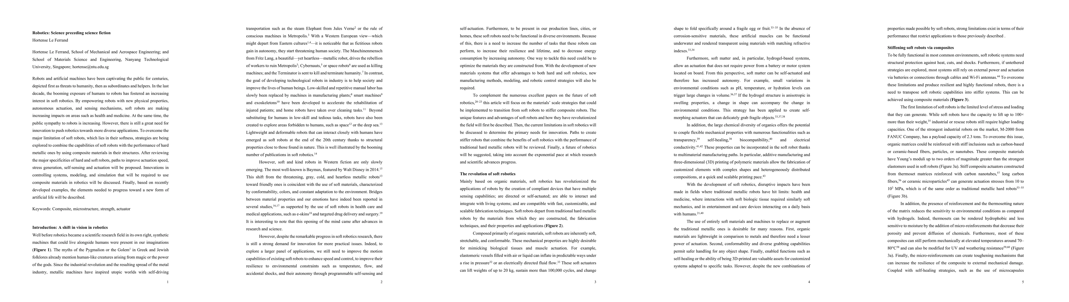 Robots and artificial machines have been captivating the public for centuries, depicted first as threats to humanity, then as subordinates and helpers. In the last decade, the booming exposure of humans to robots has fostered an increasing interest in soft robotics. By empowering robots with new physical properties, autonomous actuation, and sensing mechanisms, soft robots are making increasing impacts on areas such as health and medicine. At the same time, the public sympathy to robots is increasing. However, there is still a great need for innovation to push robotics towards more diverse applications. To overcome the major limitation of soft robots, which lies in their softness, strategies are being explored to combine the capabilities of soft robots with the performance of hard metallic ones by using composite materials in their structures. After reviewing the major specificities of hard and soft robots, paths to improve actuation speed, stress generation, self-sensing and actuation will be proposed. Innovations in controlling systems, modeling, and simulation that will be required to use composite materials in robotics will be discussed. Finally, based on recently developed examples, the elements needed to progress toward a new form of artificial life will be described.