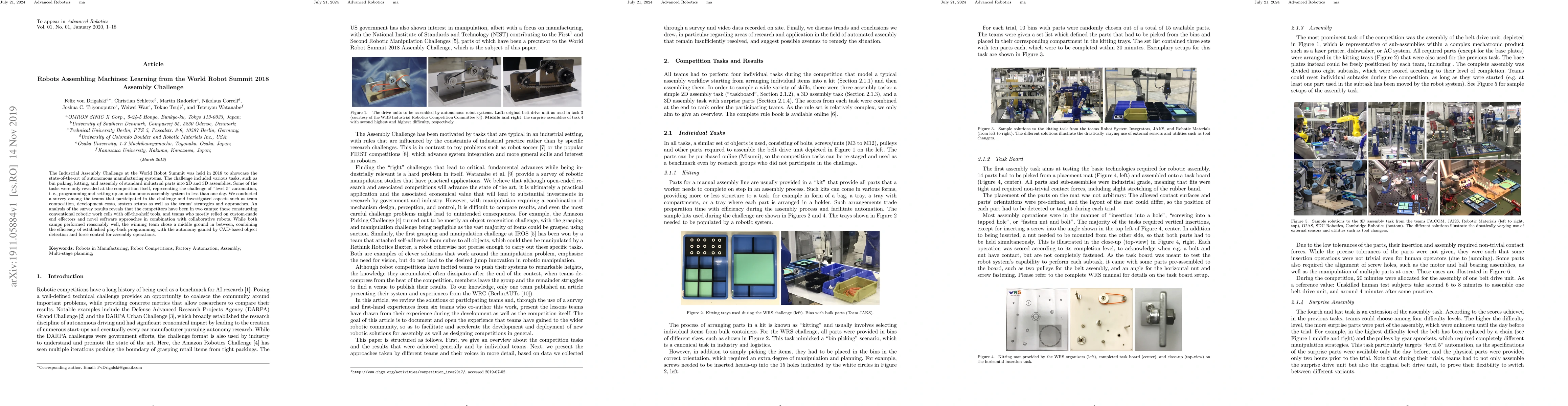 The Industrial Assembly Challenge at the World Robot Summit was held in 2018 to showcase the state-of-the-art of autonomous manufacturing systems. The challenge included various tasks, such as bin picking, kitting, and assembly of standard industrial parts into 2D and 3D assemblies. Some of the tasks were only revealed at the competition itself, representing the challenge of "level 5" automation, i. e., programming and setting up an autonomous assembly system in less than one day. We conducted a survey among the teams that participated in the challenge and investigated aspects such as team composition, development costs, system setups as well as the teams' strategies and approaches. An analysis of the survey results reveals that the competitors have been in two camps: those constructing conventional robotic work cells with off-the-shelf tools, and teams who mostly relied on custom-made end effectors and novel software approaches in combination with collaborative robots. While both camps performed reasonably well, the winning team chose a middle ground in between, combining the efficiency of established play-back programming with the autonomy gained by CAD-based object detection and force control for assembly operations.