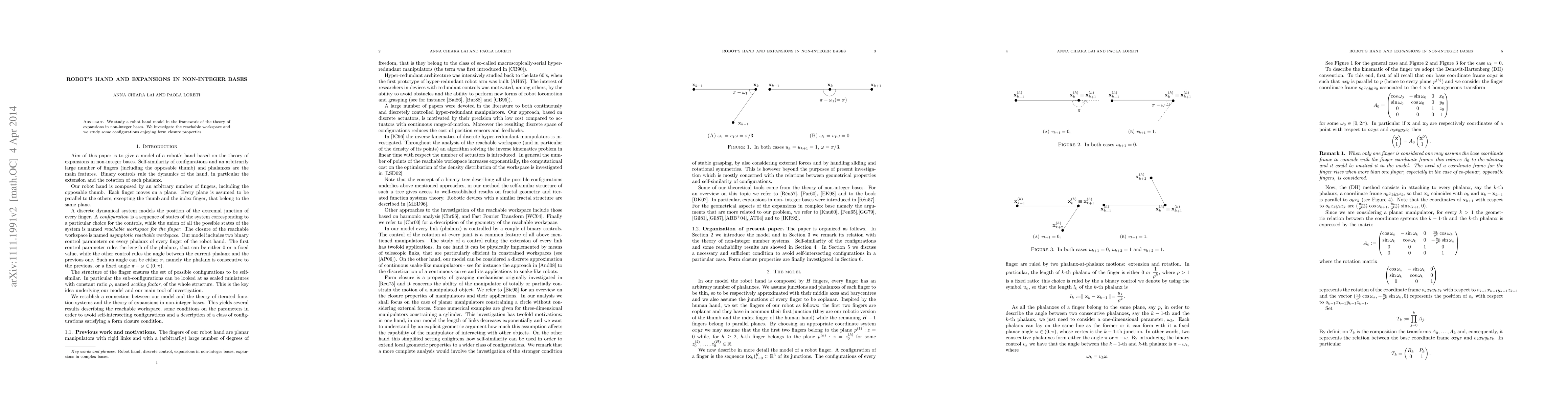 We study a robot hand model in the framework of the theory of expansions in non-integer bases. We investigate the reachable workspace and we study some configurations enjoying form closure properties.