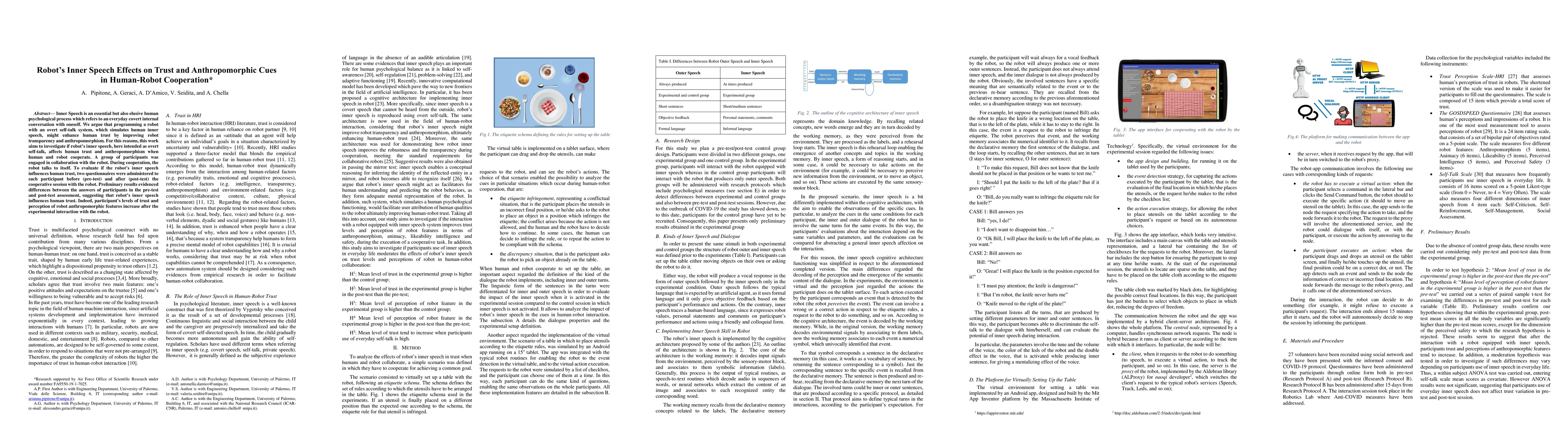 This study investigates whether a robot's overt self-talk, simulating human inner speech, enhances human trust and anthropomorphic perception during cooperation. Preliminary results indicate that participants' trust and perception of the robot's human-like traits significantly increased after interacting with the self-talking robot.