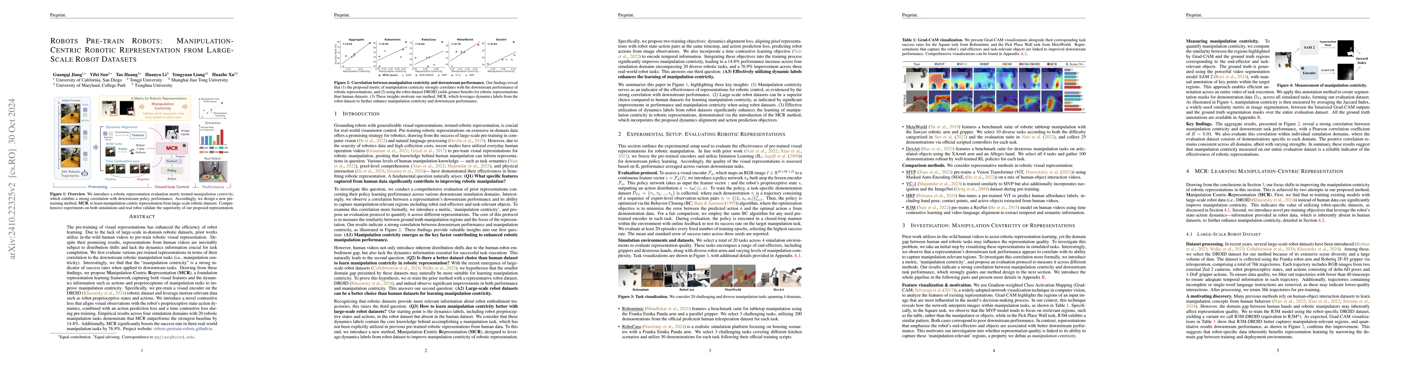 The pre-training of visual representations has enhanced the efficiency of robot learning. Due to the lack of large-scale in-domain robotic datasets, prior works utilize in-the-wild human videos to pre-train robotic visual representation. Despite their promising results, representations from human videos are inevitably subject to distribution shifts and lack the dynamics information crucial for task completion. We first evaluate various pre-trained representations in terms of their correlation to the downstream robotic manipulation tasks (i.e., manipulation centricity). Interestingly, we find that the "manipulation centricity" is a strong indicator of success rates when applied to downstream tasks. Drawing from these findings, we propose Manipulation Centric Representation (MCR), a foundation representation learning framework capturing both visual features and the dynamics information such as actions and proprioceptions of manipulation tasks to improve manipulation centricity. Specifically, we pre-train a visual encoder on the DROID robotic dataset and leverage motion-relevant data such as robot proprioceptive states and actions. We introduce a novel contrastive loss that aligns visual observations with the robot's proprioceptive state-action dynamics, combined with a behavior cloning (BC)-like actor loss to predict actions during pre-training, along with a time contrastive loss. Empirical results across 4 simulation domains with 20 tasks verify that MCR outperforms the strongest baseline method by 14.8%. Moreover, MCR boosts the performance of data-efficient learning with a UR5e arm on 3 real-world tasks by 76.9%. Project website: https://robots-pretrain-robots.github.io/.