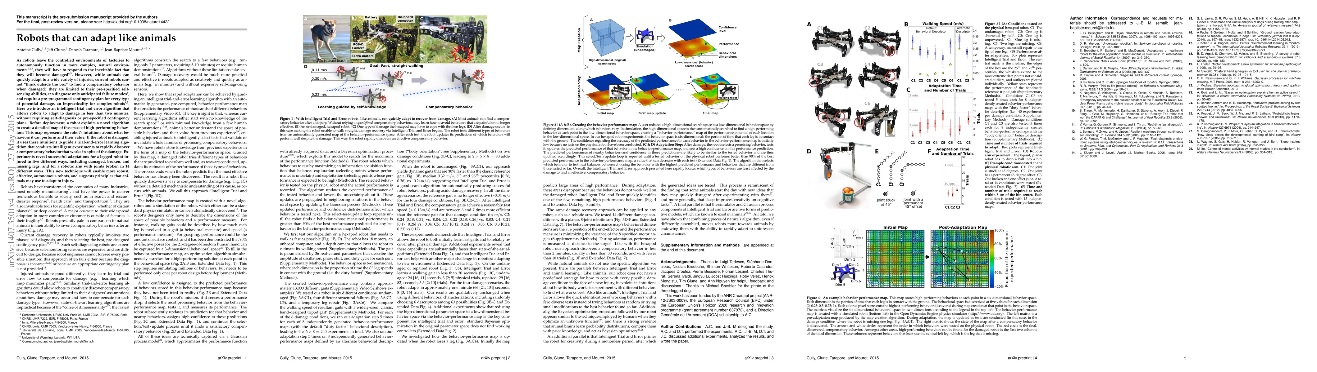 This paper introduces an intelligent trial-and-error algorithm enabling robots to adapt to damage autonomously within two minutes, without pre-diagnosis or contingency plans. The algorithm allows robots to create a behavioral space map before deployment, which guides adaptive learning in response to injuries.