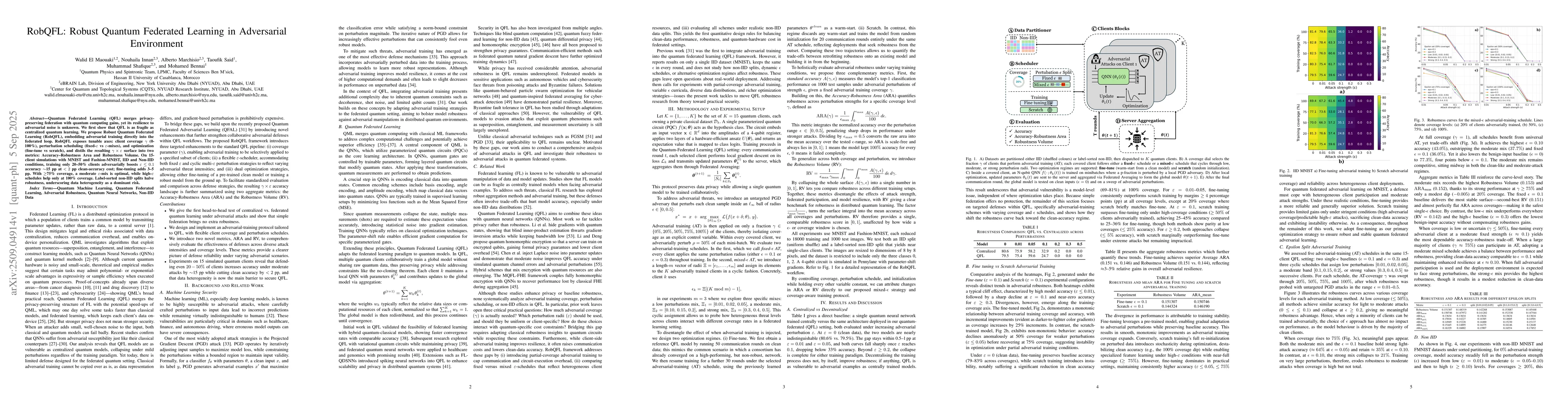 Quantum Federated Learning (QFL) merges privacy-preserving federation with quantum computing gains, yet its resilience to adversarial noise is unknown. We first show that QFL is as fragile as centralized quantum learning. We propose Robust Quantum Federated Learning (RobQFL), embedding adversarial training directly into the federated loop. RobQFL exposes tunable axes: client coverage $\gamma$ (0-100\%), perturbation scheduling (fixed-$\varepsilon$ vs $\varepsilon$-mixes), and optimization (fine-tune vs scratch), and distils the resulting $\gamma \times \varepsilon$ surface into two metrics: Accuracy-Robustness Area and Robustness Volume. On 15-client simulations with MNIST and Fashion-MNIST, IID and Non-IID conditions, training only 20-50\% clients adversarially boosts $\varepsilon \leq 0.1$ accuracy $\sim$15 pp at $< 2$ pp clean-accuracy cost; fine-tuning adds 3-5 pp. With $\geq$75\% coverage, a moderate $\varepsilon$-mix is optimal, while high-$\varepsilon$ schedules help only at 100\% coverage. Label-sorted non-IID splits halve robustness, underscoring data heterogeneity as a dominant risk.