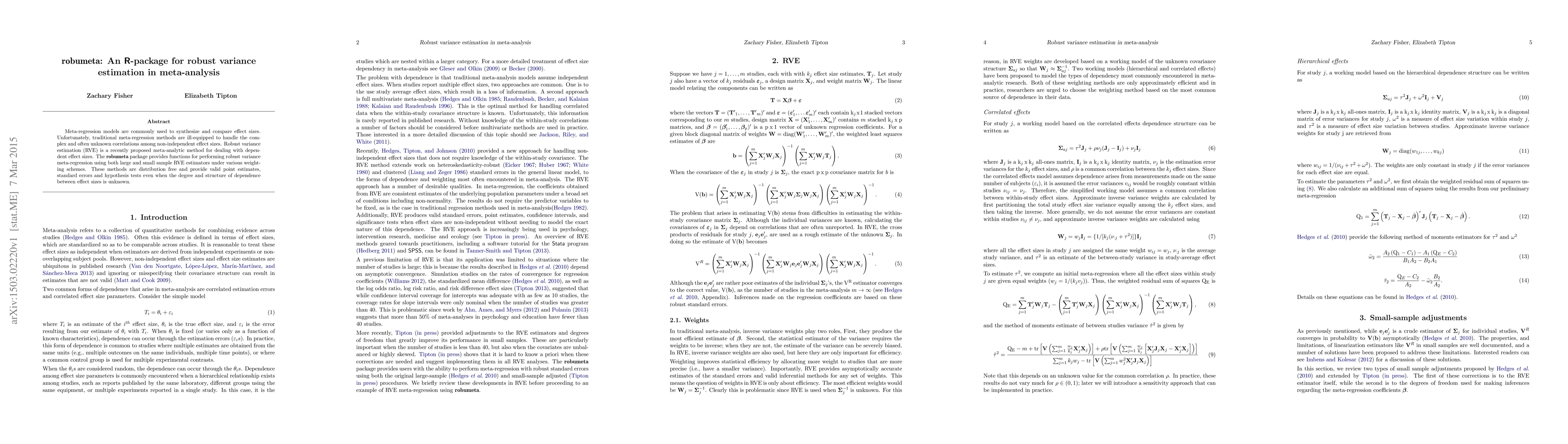 The robumeta R-package offers robust variance estimation for meta-regression, addressing the issue of dependent effect sizes through large and small sample estimators. It provides valid point estimates, standard errors, and hypothesis tests regardless of the unknown structure of effect size dependence.