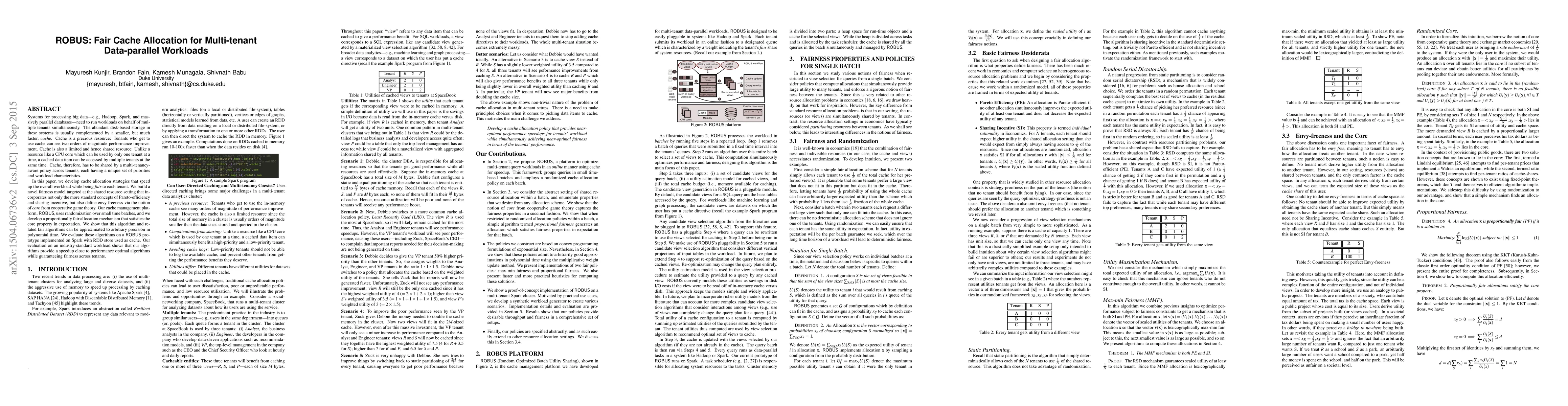 This paper introduces ROBUS, a cache allocation strategy for multi-tenant data-parallel workloads that aims to balance performance and fairness. The authors develop a novel fairness model incorporating Pareto-efficiency, sharing incentives, and envy freeness, and demonstrate that their algorithms can be approximated to arbitrary precision while achieving near-optimal speedups in a Spark environment.