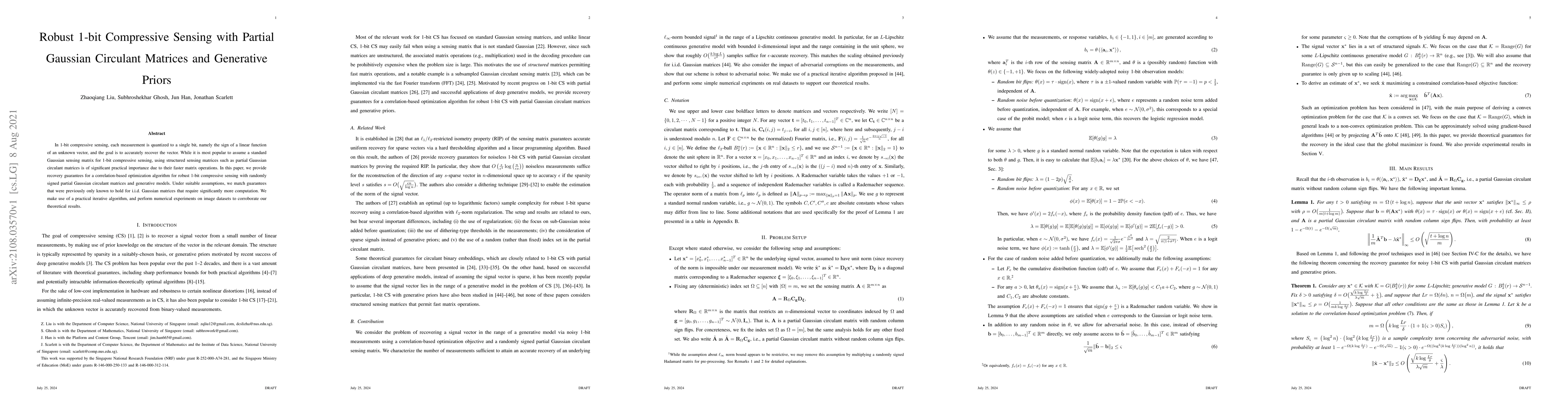 In 1-bit compressive sensing, each measurement is quantized to a single bit, namely the sign of a linear function of an unknown vector, and the goal is to accurately recover the vector. While it is most popular to assume a standard Gaussian sensing matrix for 1-bit compressive sensing, using structured sensing matrices such as partial Gaussian circulant matrices is of significant practical importance due to their faster matrix operations. In this paper, we provide recovery guarantees for a correlation-based optimization algorithm for robust 1-bit compressive sensing with randomly signed partial Gaussian circulant matrices and generative models. Under suitable assumptions, we match guarantees that were previously only known to hold for i.i.d.~Gaussian matrices that require significantly more computation. We make use of a practical iterative algorithm, and perform numerical experiments on image datasets to corroborate our theoretical results.