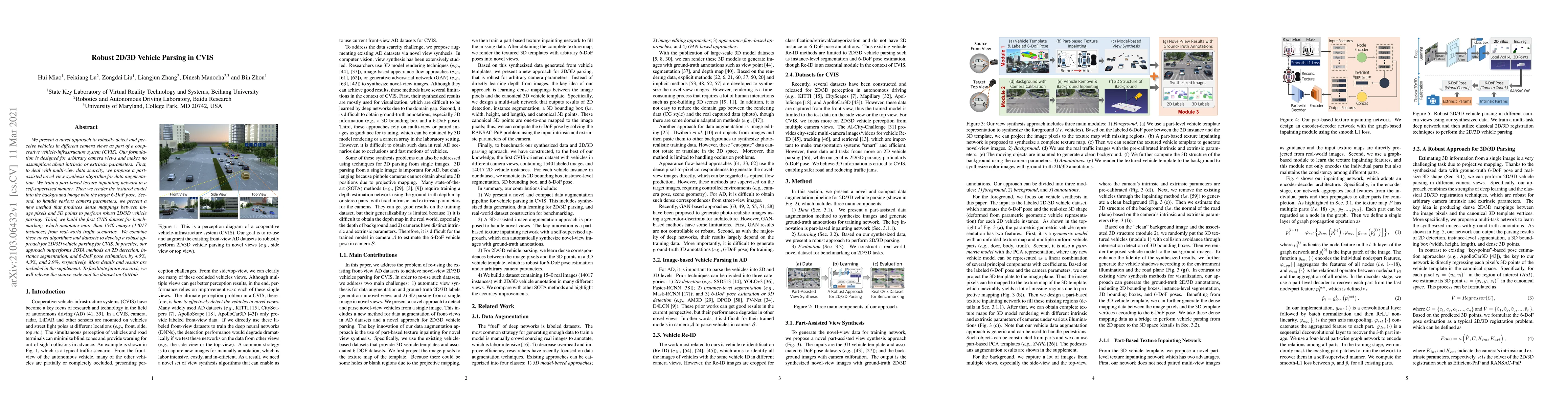 We present a novel approach to robustly detect and perceive vehicles in different camera views as part of a cooperative vehicle-infrastructure system (CVIS). Our formulation is designed for arbitrary camera views and makes no assumptions about intrinsic or extrinsic parameters. First, to deal with multi-view data scarcity, we propose a part-assisted novel view synthesis algorithm for data augmentation. We train a part-based texture inpainting network in a self-supervised manner. Then we render the textured model into the background image with the target 6-DoF pose. Second, to handle various camera parameters, we present a new method that produces dense mappings between image pixels and 3D points to perform robust 2D/3D vehicle parsing. Third, we build the first CVIS dataset for benchmarking, which annotates more than 1540 images (14017 instances) from real-world traffic scenarios. We combine these novel algorithms and datasets to develop a robust approach for 2D/3D vehicle parsing for CVIS. In practice, our approach outperforms SOTA methods on 2D detection, instance segmentation, and 6-DoF pose estimation, by 4.5%, 4.3%, and 2.9%, respectively. More details and results are included in the supplement. To facilitate future research, we will release the source code and the dataset on GitHub.