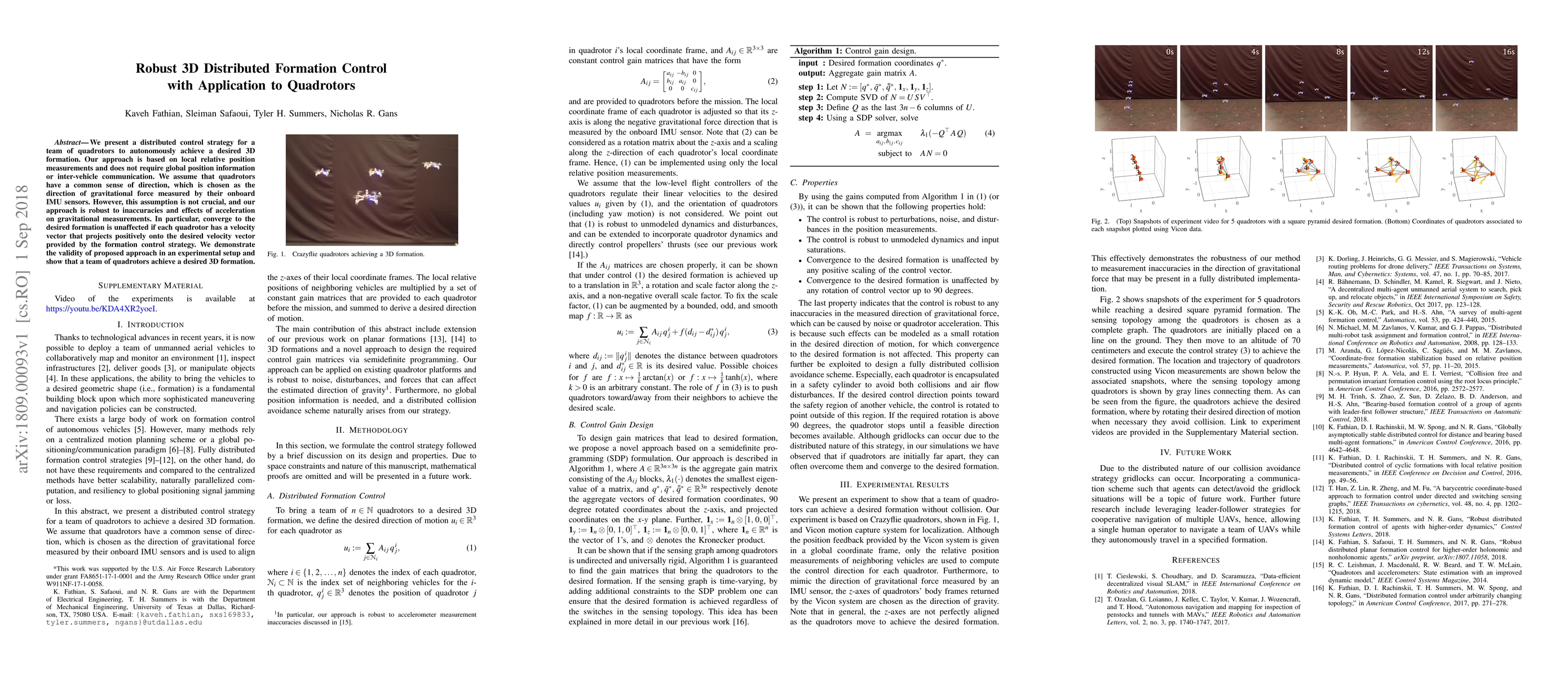 Researchers developed a robust 3D distributed formation control strategy for quadrotors without relying on global position information or inter-vehicle communication. The approach uses local relative position measurements and is shown to be effective in achieving desired formations.