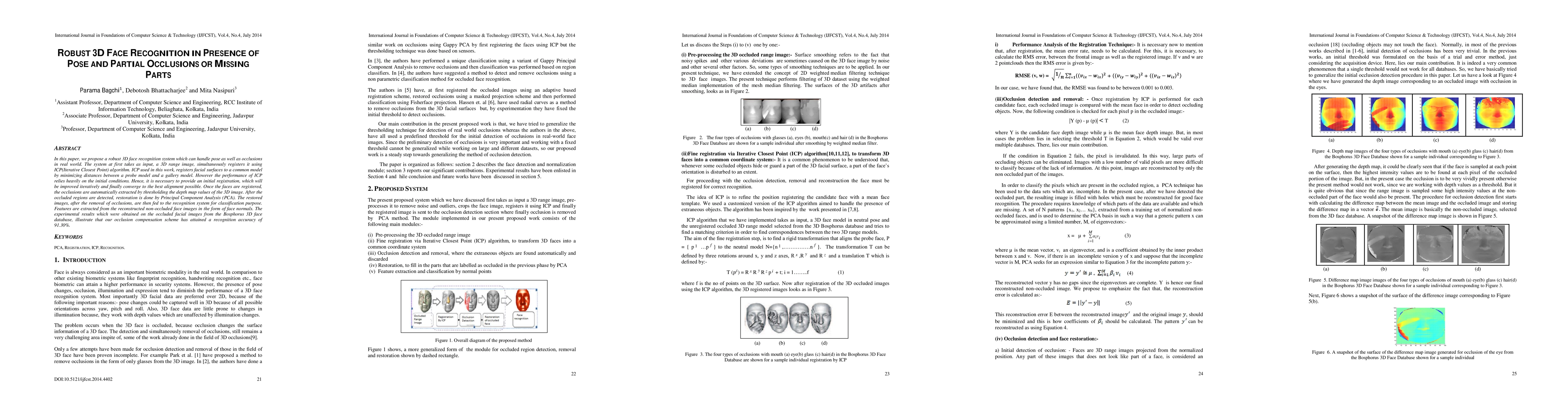 This paper presents a robust 3D face recognition system capable of handling pose variations and occlusions. It uses ICP for initial registration and PCA for occlusion restoration, achieving 91.30% recognition accuracy on the Bosphorus 3D face database.