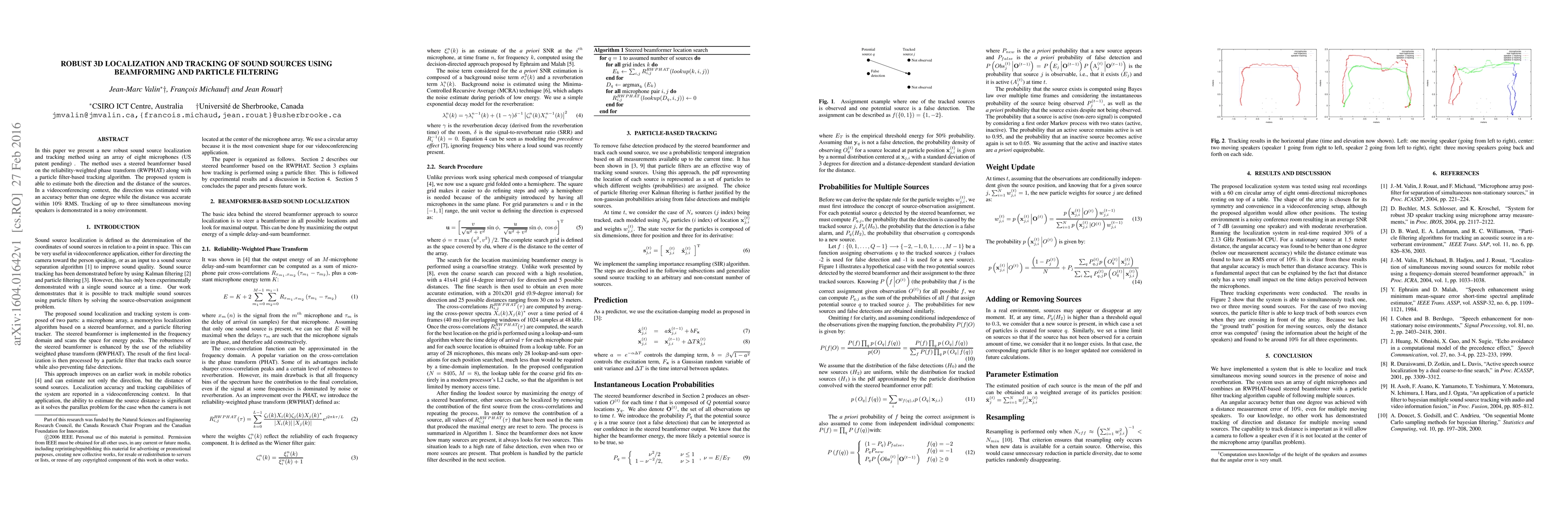 This paper introduces a novel method for robust 3D localization and tracking of sound sources using an eight-microphone array, employing a steered beamformer based on the reliability-weighted phase transform and a particle filter for tracking. The system accurately estimates both direction and distance, demonstrating high precision in a videoconferencing context.
