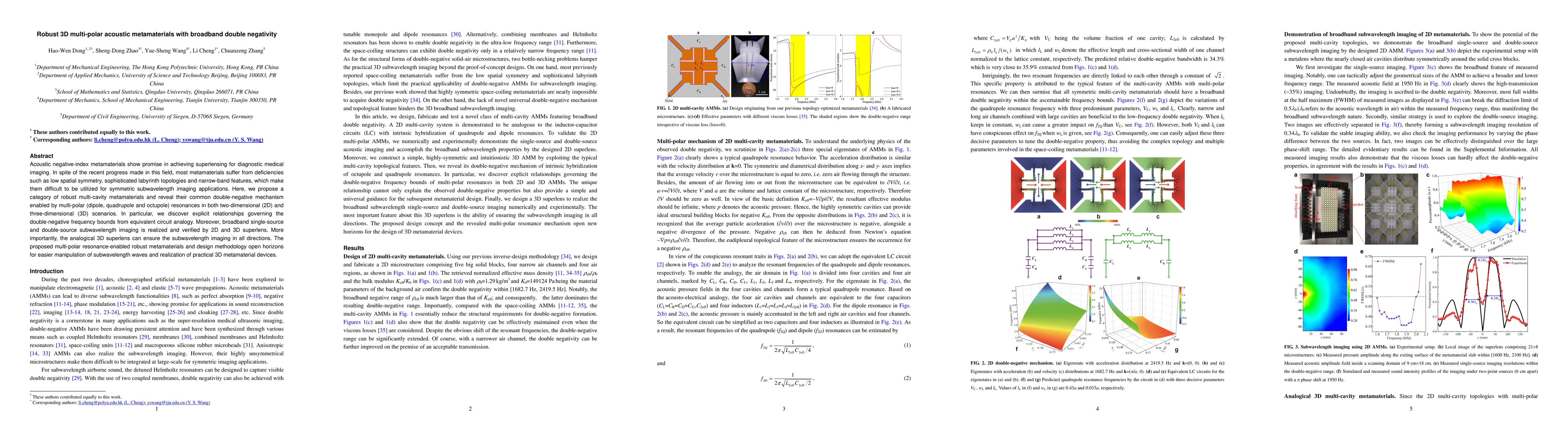 Acoustic negative-index metamaterials show promise in achieving superlensing for diagnostic medical imaging. In spite of the recent progress made in this field, most metamaterials suffer from deficiencies such as low spatial symmetry, sophisticated labyrinth topologies and narrow-band features, which make them difficult to be utilized for symmetric subwavelength imaging applications. Here, we propose a category of robust multi-cavity metamaterials and reveal their common double-negative mechanism enabled by multi-polar (dipole, quadrupole and octupole) resonances in both two-dimensional (2D) and three-dimensional (3D) scenarios. In particular, we discover explicit relationships governing the double-negative frequency bounds from equivalent circuit analogy. Moreover, broadband single-source and double-source subwavelength imaging is realized and verified by 2D and 3D superlens. More importantly, the analogical 3D superlens can ensure the subwavelength imaging in all directions. The proposed multi-polar resonance-enabled robust metamaterials and design methodology open horizons for easier manipulation of subwavelength waves and realization of practical 3D metamaterial devices.
