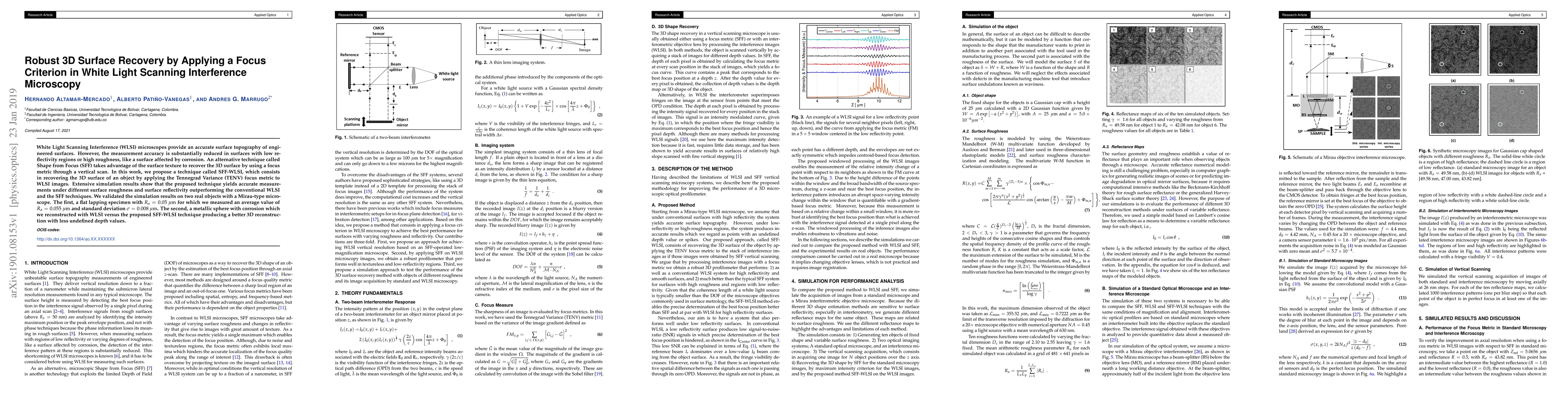 This paper proposes a technique called SFF-WLSI that uses the Tenegrad Variance focus metric to enhance 3D surface recovery in white light scanning interference microscopy, achieving more accurate measurements on surfaces with varying roughness and reflectivity compared to conventional methods. Experimental validation on real objects demonstrated improved reconstruction quality, especially for corroded surfaces.