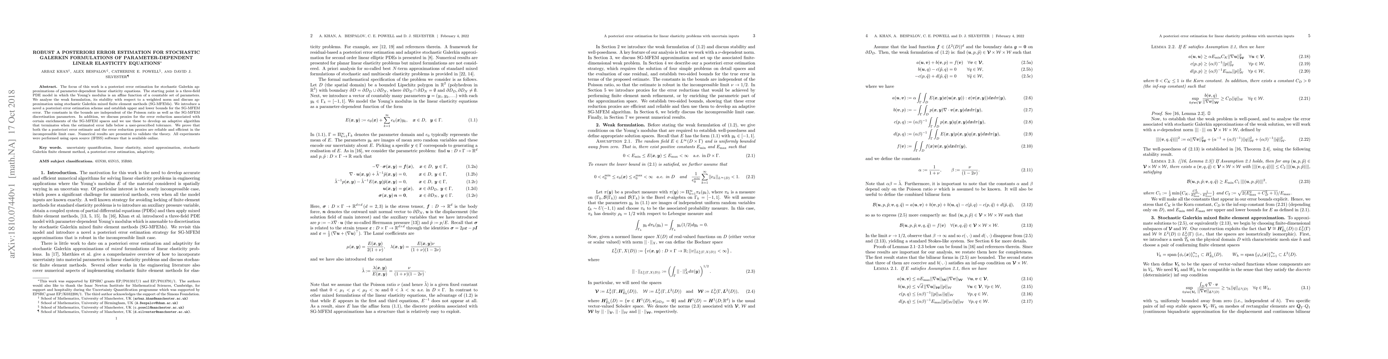 The focus of this work is a posteriori error estimation for stochastic Galerkin approximations of parameter-dependent linear elasticity equations. The starting point is a three-field PDE model in which the Young's modulus is an affine function of a countable set of parameters. We analyse the weak formulation, its stability with respect to a weighted norm and discuss approximation using stochastic Galerkin mixed finite element methods (SG-MFEMs). We introduce a novel a posteriori error estimation scheme and establish upper and lower bounds for the SG-MFEM error. The constants in the bounds are independent of the Poisson ratio as well as the SG-MFEM discretisation parameters. In addition, we discuss proxies for the error reduction associated with certain enrichments of the SG-MFEM spaces and we use these to develop an adaptive algorithm that terminates when the estimated error falls below a user-prescribed tolerance. We prove that both the a posteriori error estimate and the error reduction proxies are reliable and efficient in the incompressible limit case. Numerical results are presented to validate the theory. All experiments were performed using open source (IFISS) software that is available online.