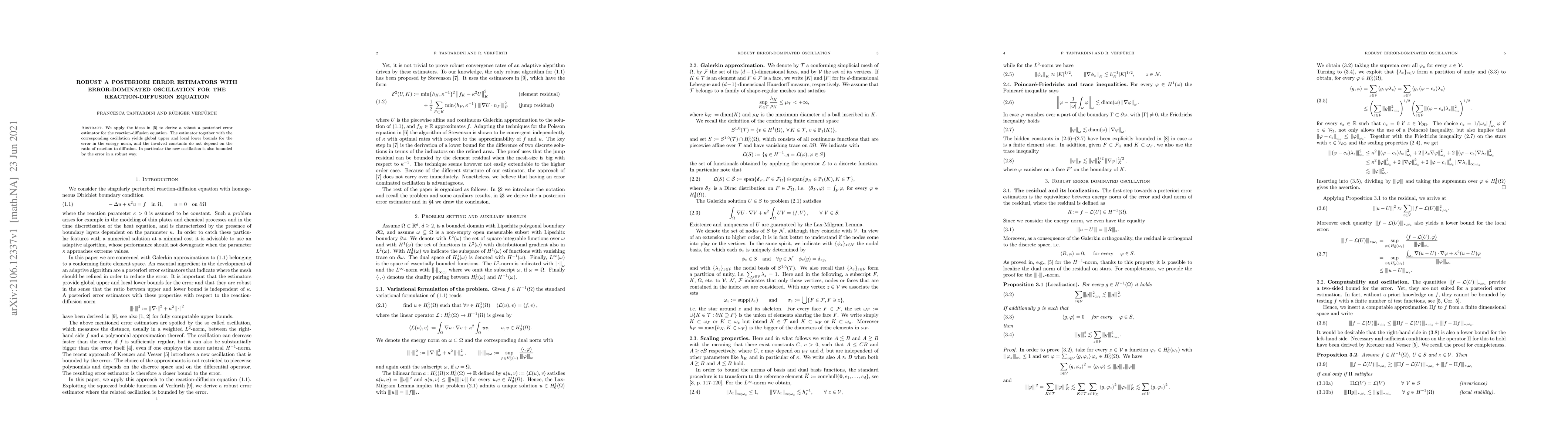 This paper develops a robust a posteriori error estimator for the reaction-diffusion equation, ensuring global upper and local lower bounds for error without dependence on the reaction-to-diffusion ratio. The new oscillation term is also robustly bounded by the error itself.
