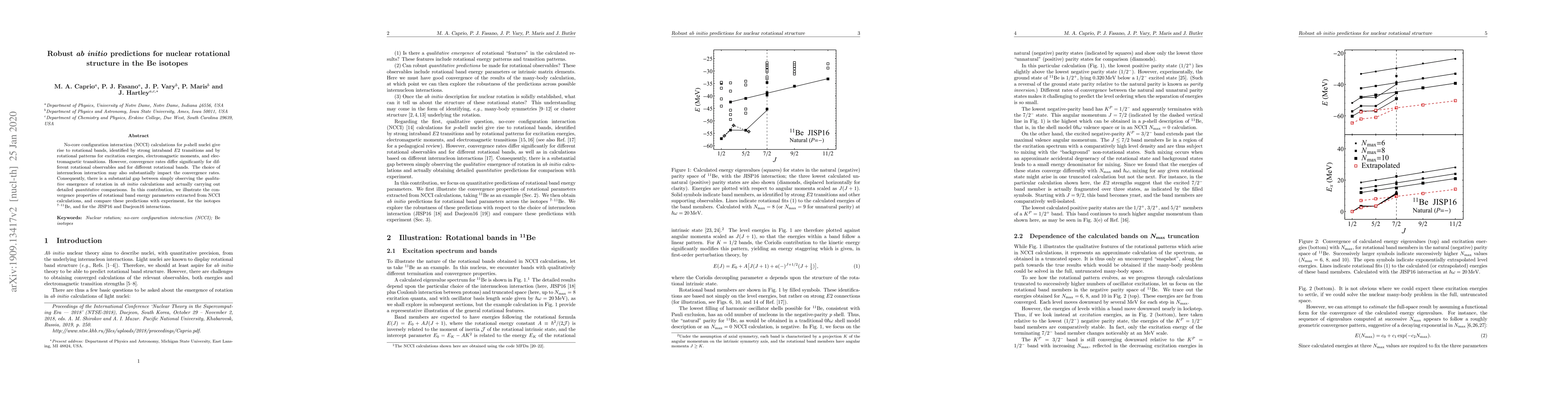 No-core configuration interaction (NCCI) calculations for p-shell nuclei give rise to rotational bands, identified by strong intraband E2 transitions and by rotational patterns for excitation energies, electromagnetic moments, and electromagnetic transitions. However, convergence rates differ significantly for different rotational observables and for different rotational bands. The choice of internucleon interaction may also substantially impact the convergence rates. Consequently, there is a substantial gap between simply observing the qualitative emergence of rotation in ab initio calculations and actually carrying out detailed quantitative comparisons. In this contribution, we illustrate the convergence properties of rotational band energy parameters extracted from NCCI calculations, and compare these predictions with experiment, for the isotopes 7-11Be, and for the JISP16 and Daejeon16 interactions.