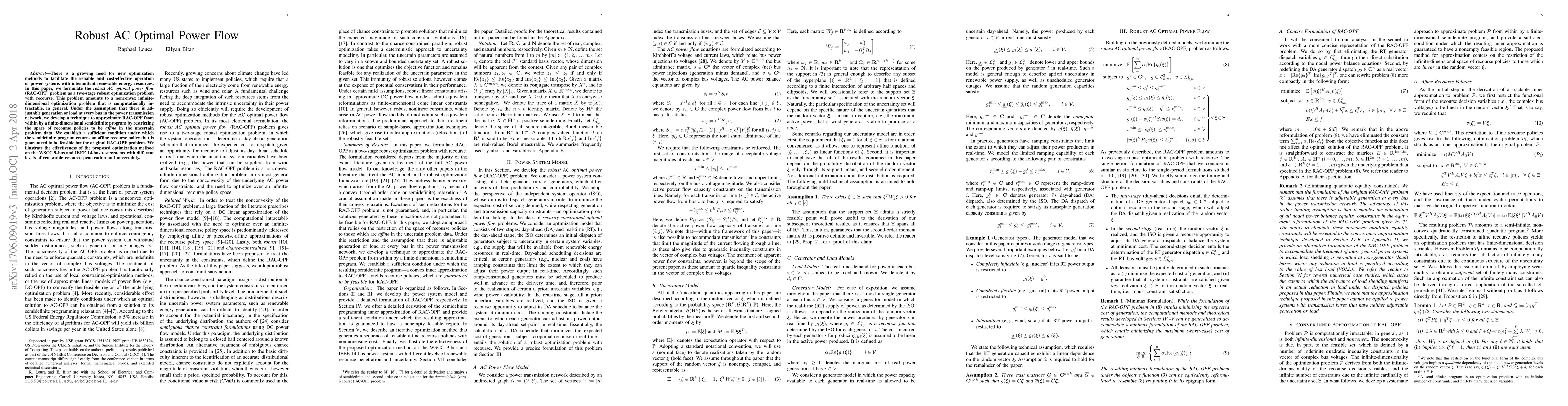 This paper proposes a robust AC optimal power flow (RAC-OPF) method to optimize power systems with intermittent renewable resources. It transforms the intractable RAC-OPF problem into a finite-dimensional semidefinite program, ensuring feasible affine recourse policies under certain conditions, and demonstrates its effectiveness on test systems.