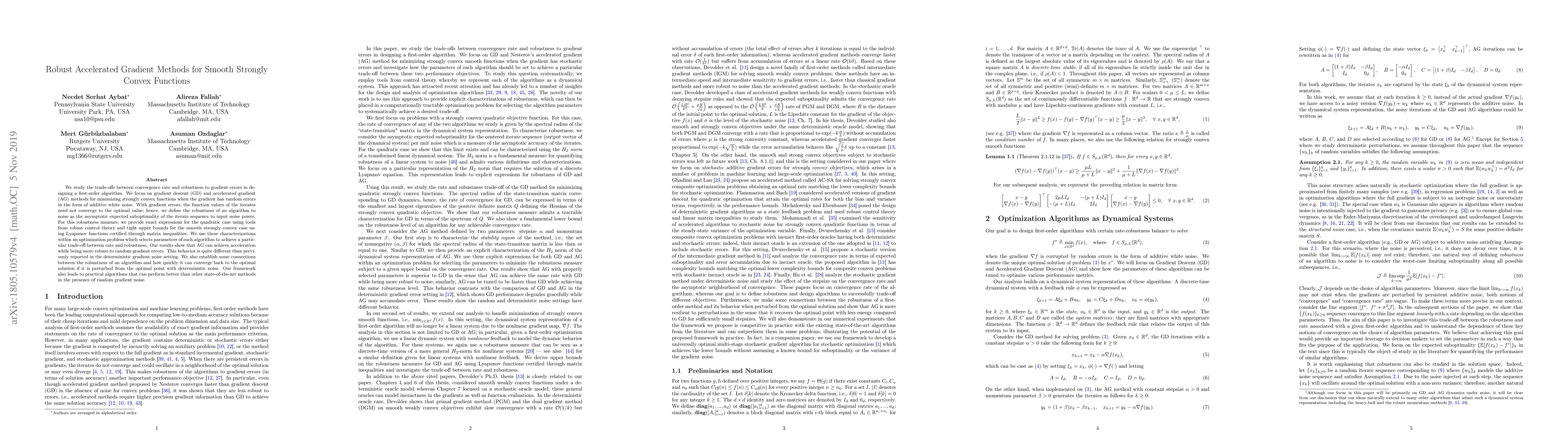 We study the trade-offs between convergence rate and robustness to gradient errors in designing a first-order algorithm. We focus on gradient descent (GD) and accelerated gradient (AG) methods for minimizing strongly convex functions when the gradient has random errors in the form of additive white noise. With gradient errors, the function values of the iterates need not converge to the optimal value; hence, we define the robustness of an algorithm to noise as the asymptotic expected suboptimality of the iterate sequence to input noise power. For this robustness measure, we provide exact expressions for the quadratic case using tools from robust control theory and tight upper bounds for the smooth strongly convex case using Lyapunov functions certified through matrix inequalities. We use these characterizations within an optimization problem which selects parameters of each algorithm to achieve a particular trade-off between rate and robustness. Our results show that AG can achieve acceleration while being more robust to random gradient errors. This behavior is quite different than previously reported in the deterministic gradient noise setting. We also establish some connections between the robustness of an algorithm and how quickly it can converge back to the optimal solution if it is perturbed from the optimal point with deterministic noise. Our framework also leads to practical algorithms that can perform better than other state-of-the-art methods in the presence of random gradient noise.