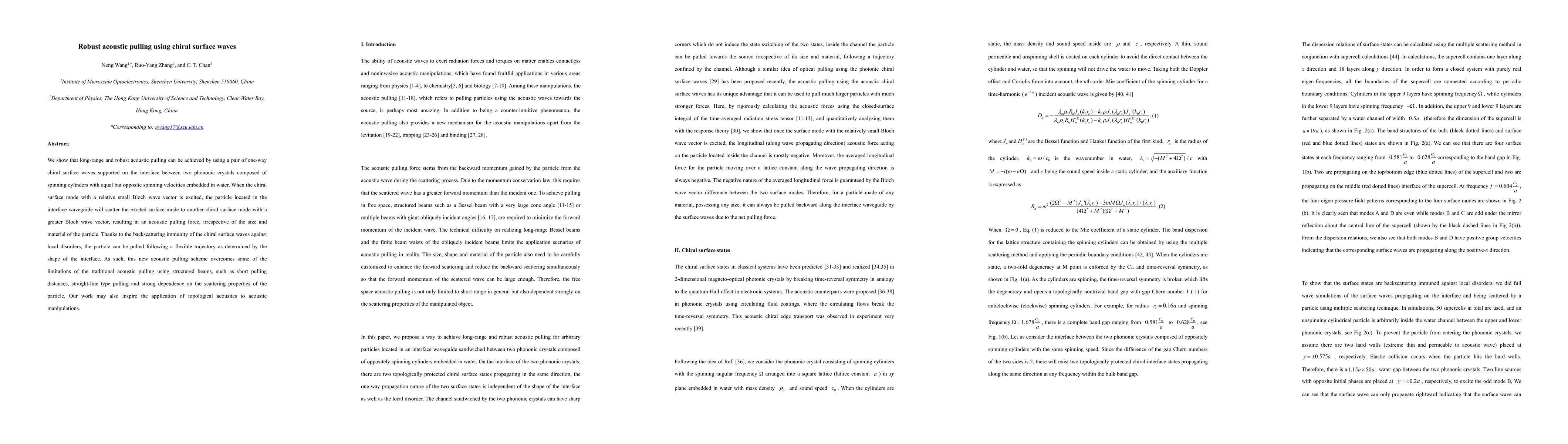 The research demonstrates robust acoustic pulling using chiral surface waves generated by spinning cylinders in water. This method overcomes limitations of traditional acoustic pulling, enabling long-range, flexible trajectory pulling irrespective of particle size or material, and paving the way for topological acoustics applications in acoustic manipulations.