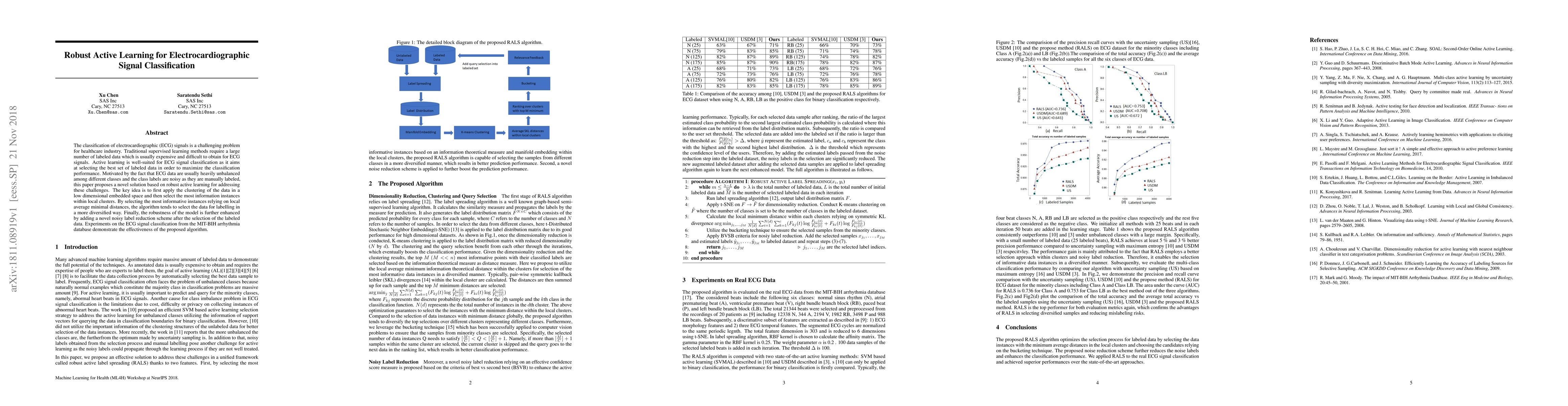 The classification of electrocardiographic (ECG) signals is a challenging problem for healthcare industry. Traditional supervised learning methods require a large number of labeled data which is usually expensive and difficult to obtain for ECG signals. Active learning is well-suited for ECG signal classification as it aims at selecting the best set of labeled data in order to maximize the classification performance. Motivated by the fact that ECG data are usually heavily unbalanced among different classes and the class labels are noisy as they are manually labeled, this paper proposes a novel solution based on robust active learning for addressing these challenges. The key idea is to first apply the clustering of the data in a low dimensional embedded space and then select the most information instances within local clusters. By selecting the most informative instances relying on local average minimal distances, the algorithm tends to select the data for labelling in a more diversified way. Finally, the robustness of the model is further enhanced by adding a novel noisy label reduction scheme after the selection of the labeled data. Experiments on the ECG signal classification from the MIT-BIH arrhythmia database demonstrate the effectiveness of the proposed algorithm.