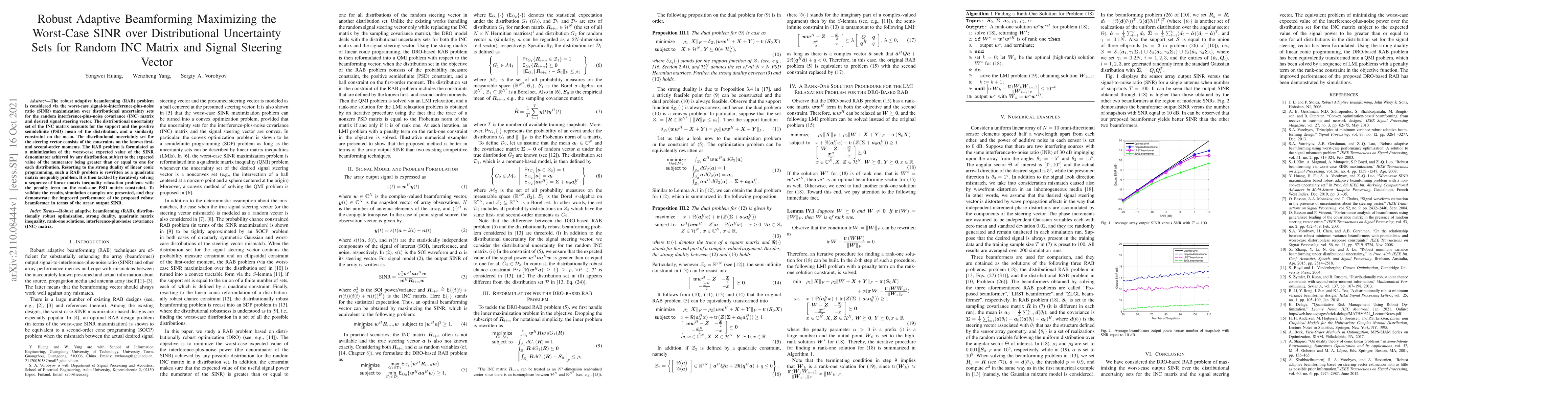 This paper proposes a robust adaptive beamforming method that maximizes the worst-case SINR under distributional uncertainty for the INC matrix and signal steering vector. The method iteratively solves a sequence of linear matrix inequality relaxation problems to achieve optimal performance, validated by simulations showing improved array output SINR.