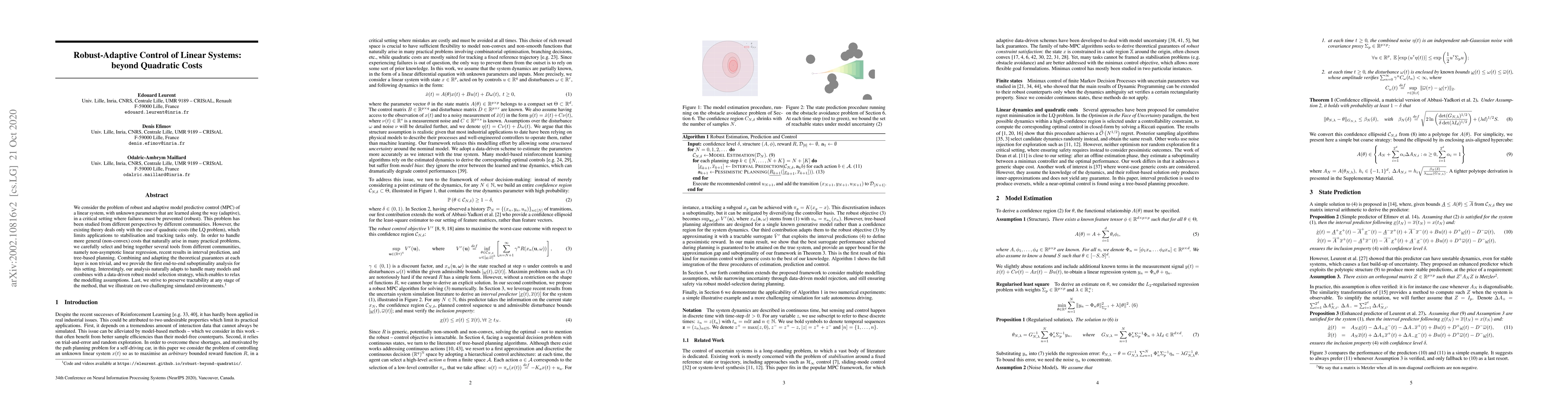 We consider the problem of robust and adaptive model predictive control (MPC) of a linear system, with unknown parameters that are learned along the way (adaptive), in a critical setting where failures must be prevented (robust). This problem has been studied from different perspectives by different communities. However, the existing theory deals only with the case of quadratic costs (the LQ problem), which limits applications to stabilisation and tracking tasks only. In order to handle more general (non-convex) costs that naturally arise in many practical problems, we carefully select and bring together several tools from different communities, namely non-asymptotic linear regression, recent results in interval prediction, and tree-based planning. Combining and adapting the theoretical guarantees at each layer is non trivial, and we provide the first end-to-end suboptimality analysis for this setting. Interestingly, our analysis naturally adapts to handle many models and combines with a data-driven robust model selection strategy, which enables to relax the modelling assumptions. Last, we strive to preserve tractability at any stage of the method, that we illustrate on two challenging simulated environments.