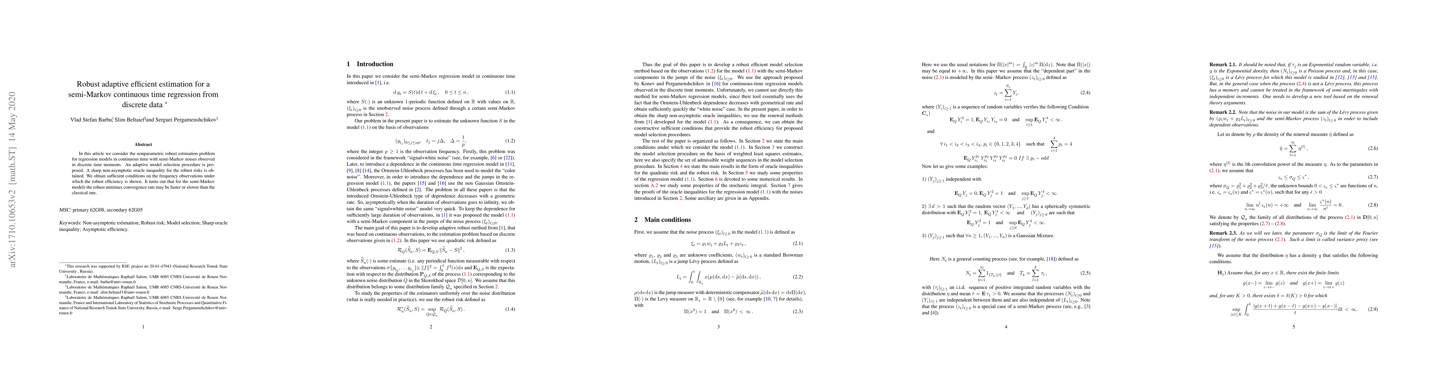 This paper proposes an adaptive model selection procedure for robust estimation in continuous time semi-Markov regression models observed at discrete time points. It establishes a sharp non-asymptotic oracle inequality and sufficient conditions for robust efficiency, revealing that the minimax convergence rate can differ from the classical rate.