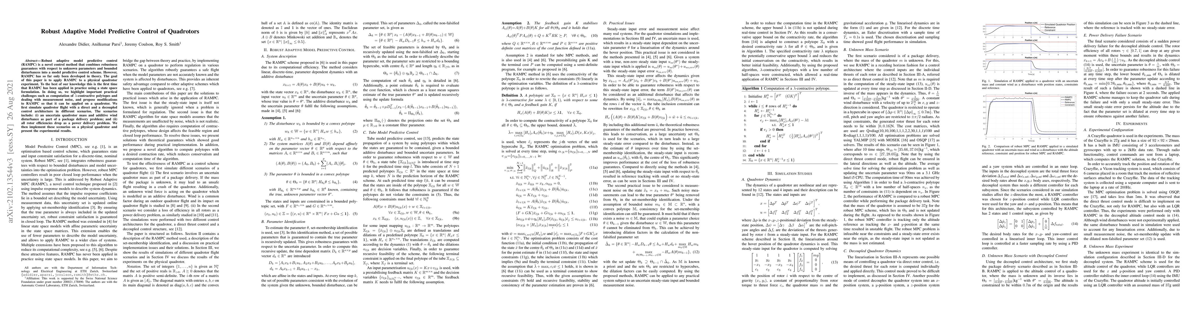 Researchers apply robust adaptive model predictive control to a quadrotor experiment for the first time, demonstrating its feasibility in practice despite practical challenges like computation of $ heta$-contractive polytopes and measurement noise. The results show successful navigation through simulated scenarios with unknown parameters and bounded disturbances.