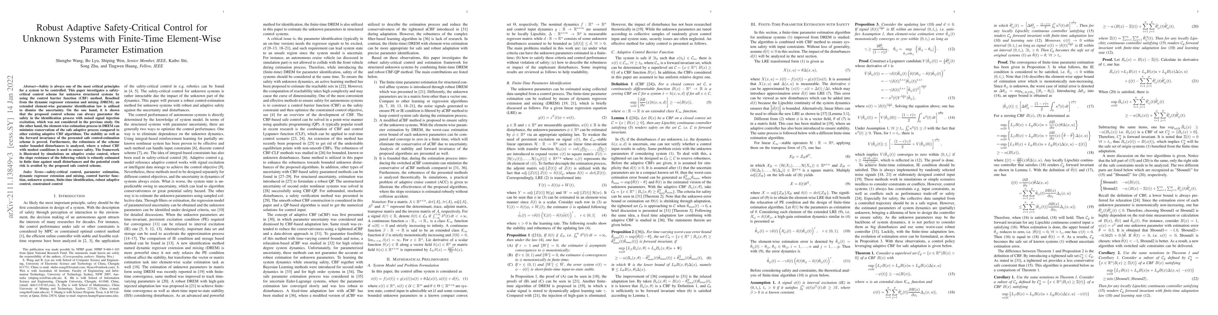 Safety is always one of the most critical principles for a system to be controlled. This paper investigates a safety-critical control scheme for unknown structured systems by using the control barrier function (CBF) method. Benefited from the dynamic regressor extension and mixing (DREM), an extended element-wise parameter identification law is utilized to dismiss the uncertainty. On the one hand, it is shown that the proposed control scheme can always guarantee the safety in the identification process with noised signal injection excitation, which was not considered in the previous study. On the other hand, the element-wise estimation process in DREM can minimize conservatism of the safe adaptive process compared to other existing adaptive CBF algorithms. The stability as well as the forward invariance of the presented safe control-estimation scheme is proved. Furthermore, the robustness of the scheme under bounded disturbances is analyzed, where a robust CBF with modest conditions is used to ensure safety. The framework is illustrated by simulations on adaptive cruise control, where the slope resistance of the following vehicle is robustly estimated in finite time against small disturbances and the potential crash risk is avoided by the proposed safe control scheme.