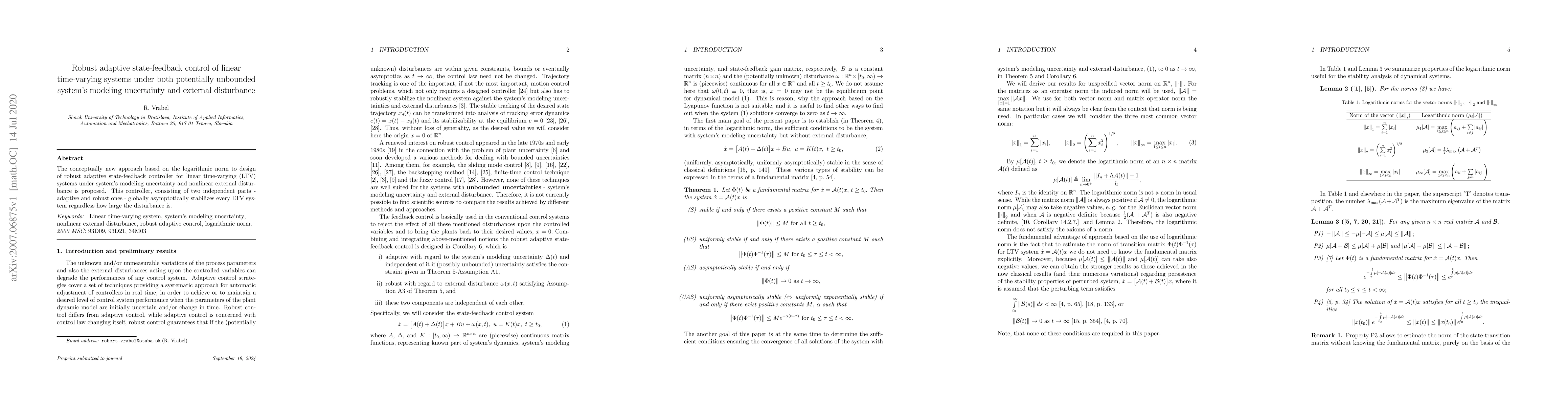 The conceptually new approach based on the logarithmic norm to design of robust adaptive state-feedback controller for linear time-varying (LTV) systems under system's modeling uncertainty and nonlinear external disturbance is proposed. This controller, consisting of two independent parts - adaptive and robust ones - globally asymptotically stabilizes every LTV system regardless how large the disturbance is.
