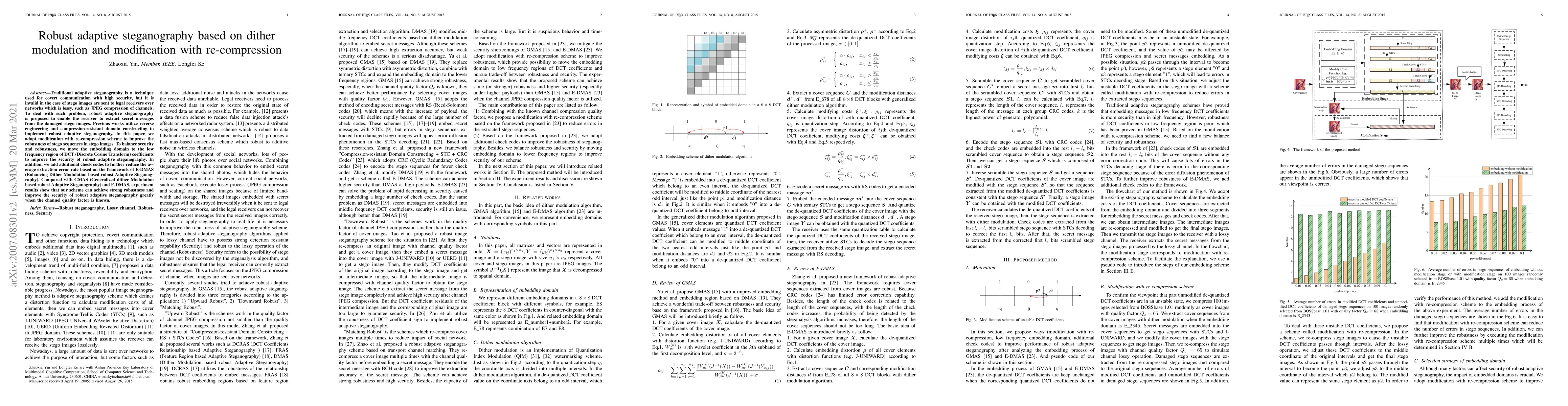 This paper proposes a robust adaptive steganography method using a modification with re-compression scheme to enhance the robustness of stego images against lossy channels like JPEG compression. The method embeds data in the low frequency region of DCT coefficients and adds check codes to reduce extraction error rates, achieving better robustness and security compared to existing methods.