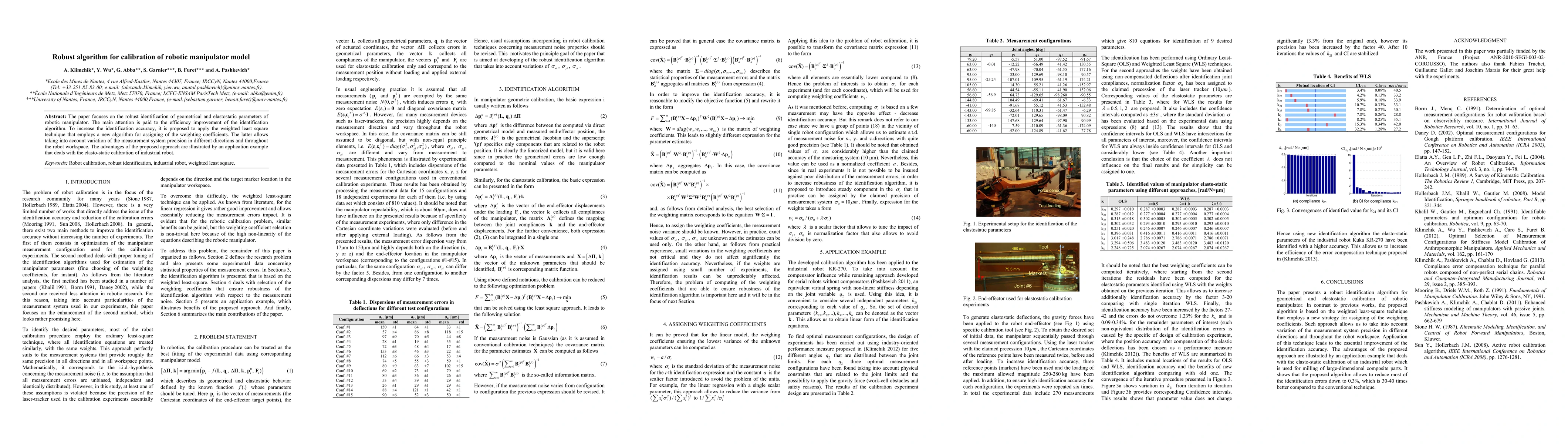 The paper focuses on the robust identification of geometrical and elastostatic parameters of robotic manipulator. The main attention is paid to the efficiency improvement of the identification algorithm. To increase the identification accuracy, it is proposed to apply the weighted least square technique that employs a new algorithm for assigning of the weighting coefficients. The latter allows taking into account variation of the measurement system precision in different directions and throughout the robot workspace. The advantages of the proposed approach are illustrated by an application example that deals with the elasto-static calibration of industrial robot.