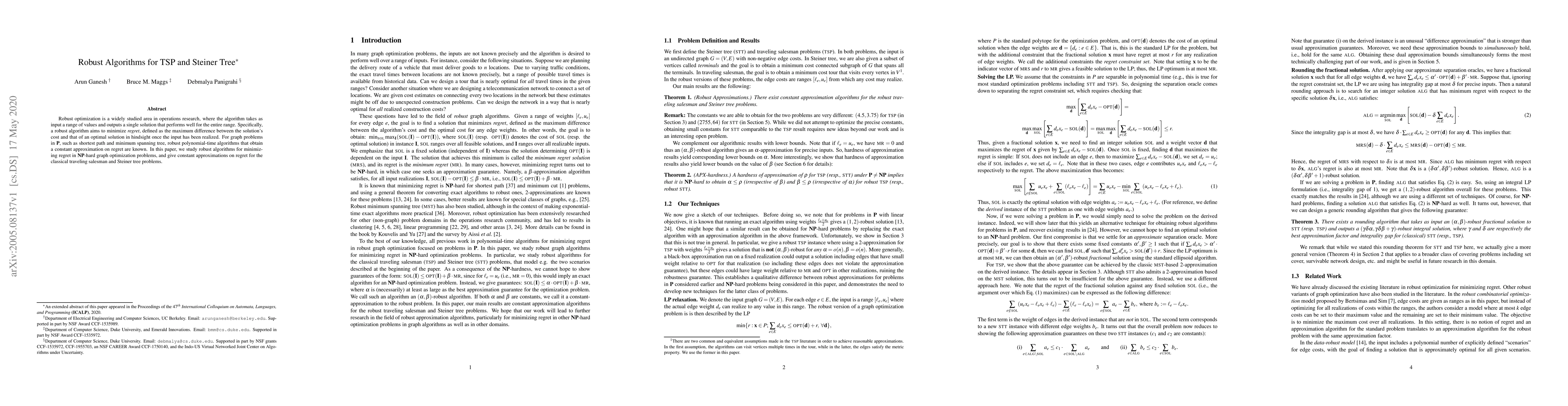 This paper develops robust algorithms for minimizing regret in NP-hard graph optimization problems, providing constant approximations for the traveling salesman and Steiner tree problems. The focus is on algorithms that perform well across a range of possible input values, minimizing the difference between their cost and that of optimal solutions once the input is known.