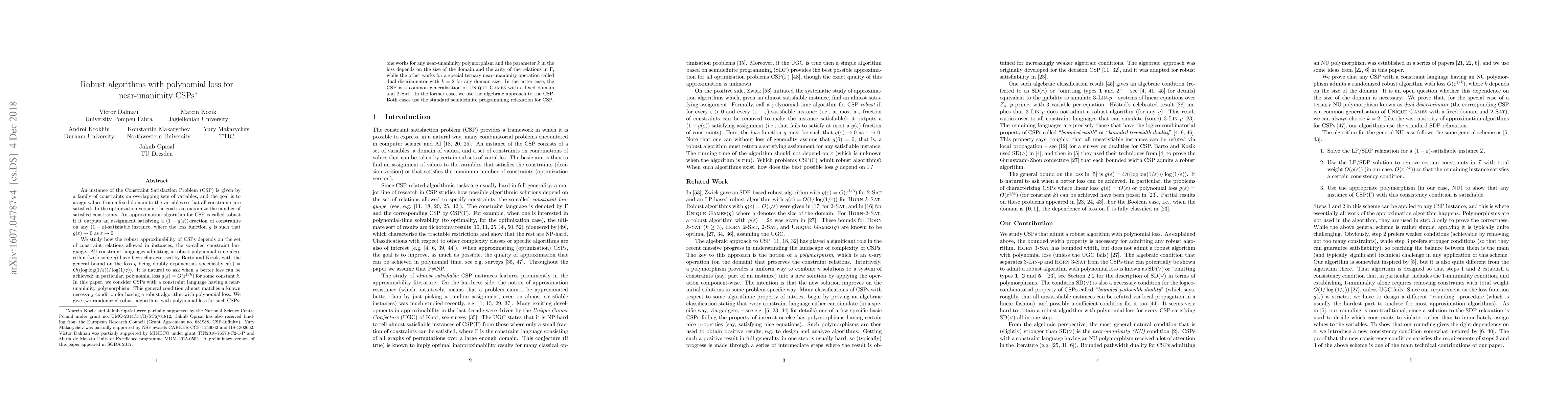 An instance of the Constraint Satisfaction Problem (CSP) is given by a family of constraints on overlapping sets of variables, and the goal is to assign values from a fixed domain to the variables so that all constraints are satisfied. In the optimization version, the goal is to maximize the number of satisfied constraints. An approximation algorithm for CSP is called robust if it outputs an assignment satisfying a $(1-g(\varepsilon))$-fraction of constraints on any $(1-\varepsilon)$-satisfiable instance, where the loss function $g$ is such that $g(\varepsilon)\rightarrow 0$ as $\varepsilon\rightarrow 0$. We study how the robust approximability of CSPs depends on the set of constraint relations allowed in instances, the so-called constraint language. All constraint languages admitting a robust polynomial-time algorithm (with some $g$) have been characterised by Barto and Kozik, with the general bound on the loss $g$ being doubly exponential, specifically $g(\varepsilon)=O((\log\log(1/\varepsilon))/\log(1/\varepsilon))$. It is natural to ask when a better loss can be achieved: in particular, polynomial loss $g(\varepsilon)=O(\varepsilon^{1/k})$ for some constant $k$. In this paper, we consider CSPs with a constraint language having a near-unanimity polymorphism. We give two randomized robust algorithms with polynomial loss for such CSPs: one works for any near-unanimity polymorphism and the parameter $k$ in the loss depends on the size of the domain and the arity of the relations in $\Gamma$, while the other works for a special ternary near-unanimity operation called dual discriminator with $k=2$ for any domain size. In the latter case, the CSP is a common generalisation of Unique Games with a fixed domain and 2-SAT. In the former case, we use the algebraic approach to the CSP. Both cases use the standard semidefinite programming relaxation for CSP.