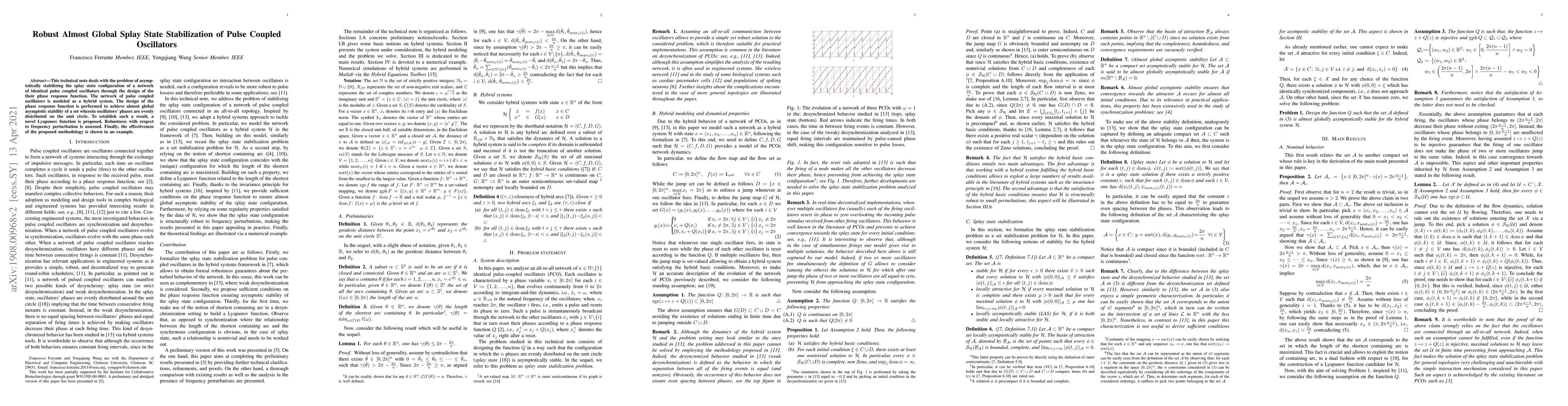 This technical note deals with the problem of asymptotically stabilizing the splay state configuration of a network of identical pulse coupled oscillators through the design of the their phase response function. The network of pulse coupled oscillators is modeled as a hybrid system. The design of the phase response function is performed to achieve almost global asymptotic stability of a set wherein oscillators' phases are evenly distributed on the unit circle. To establish such a result, a novel Lyapunov function is proposed. Robustness with respect to frequency perturbation is assessed. Finally, the effectiveness of the proposed methodology is shown in an example.