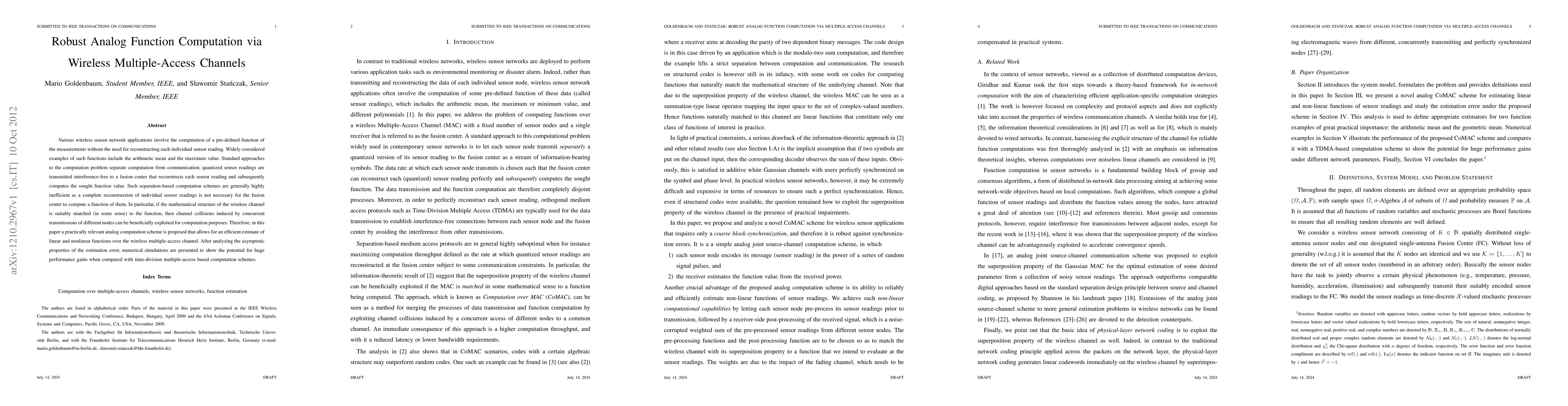 This paper proposes an efficient analog computation scheme for wireless sensor networks that leverages wireless multiple-access channels to estimate linear and nonlinear functions without reconstructing individual sensor readings. The method exploits channel collisions to achieve significant performance gains over traditional time-division multiple-access based computation schemes.
