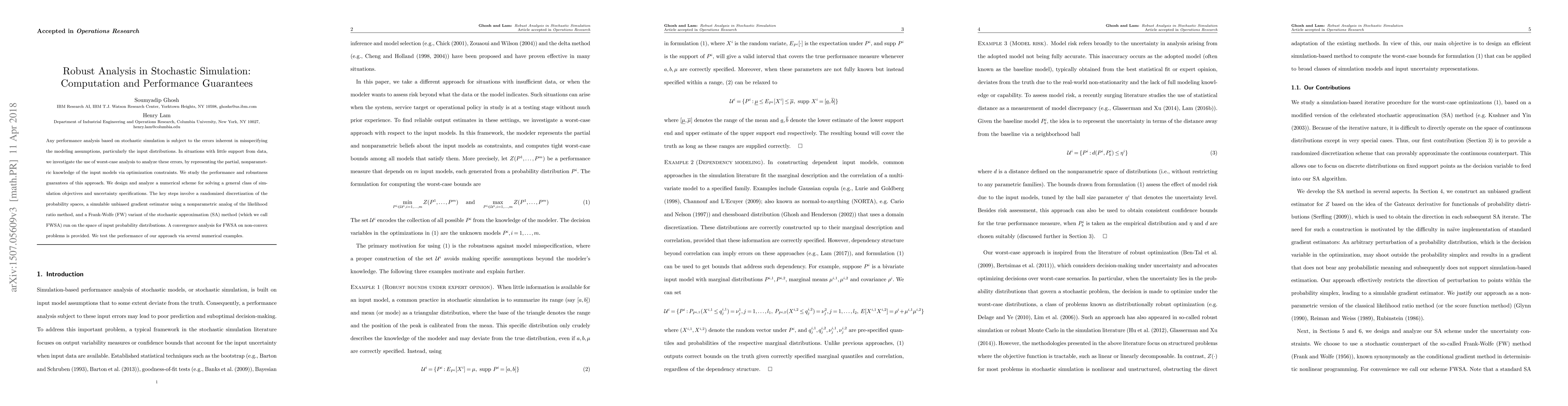 Researchers developed a method to analyze errors in stochastic simulation by using worst-case analysis, providing robust performance guarantees for nonparametric models. The approach uses optimization constraints and a variant of the stochastic approximation method to minimize uncertainty.