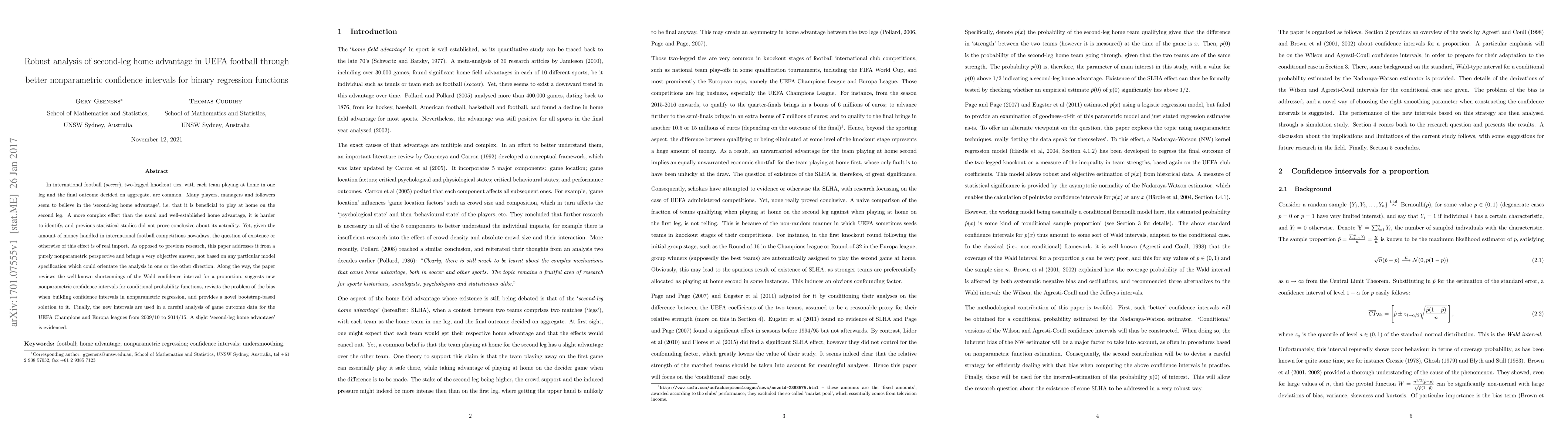 This paper investigates the "second-leg home advantage" in UEFA football using nonparametric confidence intervals for binary regression, finding a slight advantage for teams playing at home in the second leg. The study addresses previous statistical inconclusiveness by employing a model-free approach and introducing a novel bootstrap-based solution to bias in nonparametric regression.