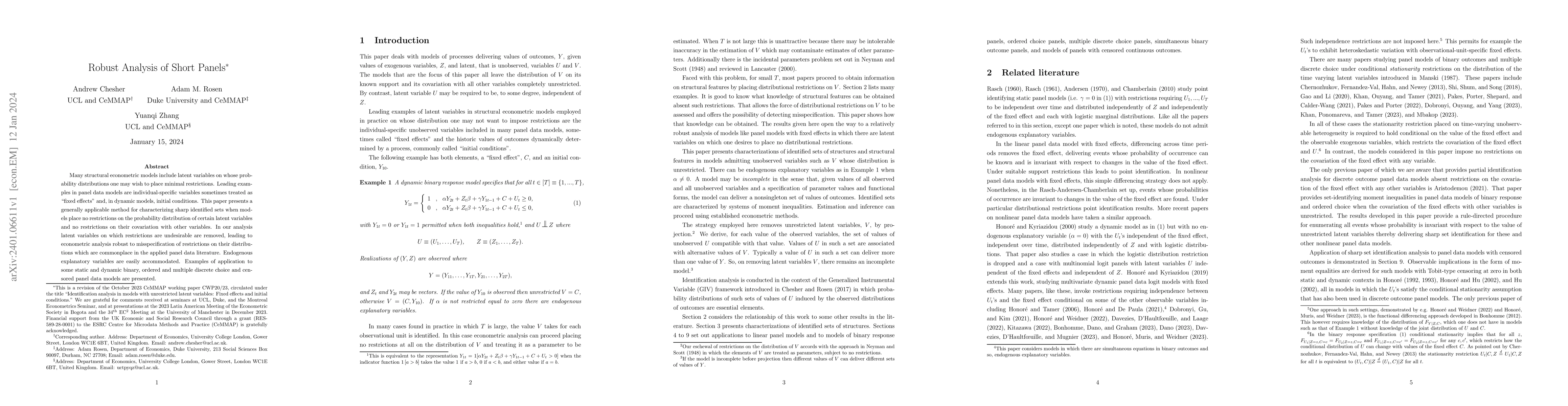 Many structural econometric models include latent variables on whose probability distributions one may wish to place minimal restrictions. Leading examples in panel data models are individual-specific variables sometimes treated as "fixed effects" and, in dynamic models, initial conditions. This paper presents a generally applicable method for characterizing sharp identified sets when models place no restrictions on the probability distribution of certain latent variables and no restrictions on their covariation with other variables. In our analysis latent variables on which restrictions are undesirable are removed, leading to econometric analysis robust to misspecification of restrictions on their distributions which are commonplace in the applied panel data literature. Endogenous explanatory variables are easily accommodated. Examples of application to some static and dynamic binary, ordered and multiple discrete choice and censored panel data models are presented.