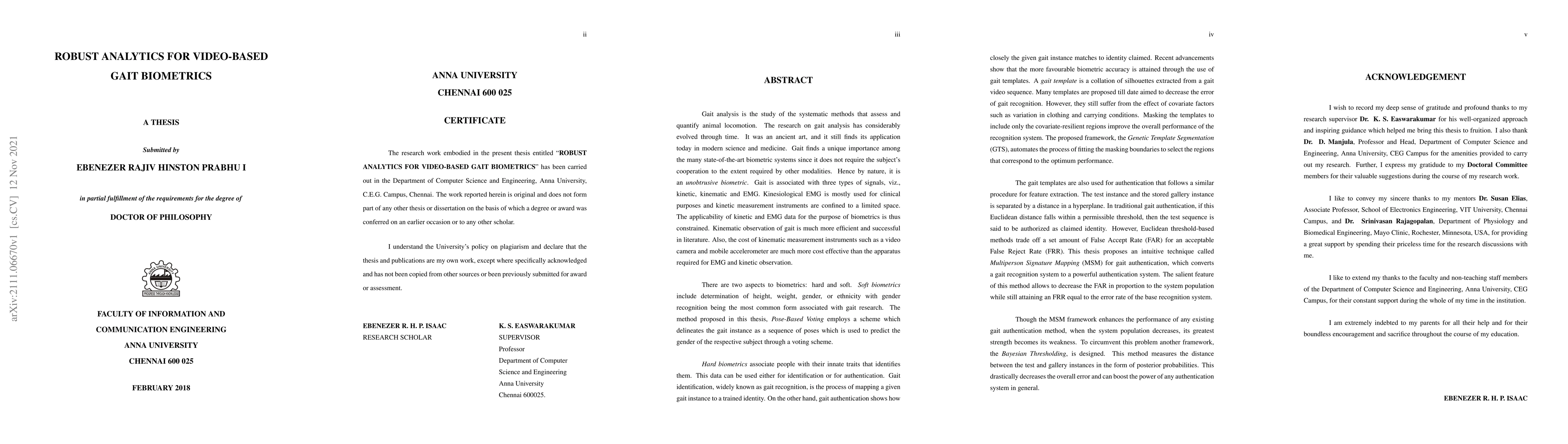 Gait analysis is the study of the systematic methods that assess and quantify animal locomotion. Gait finds a unique importance among the many state-of-the-art biometric systems since it does not require the subject's cooperation to the extent required by other modalities. Hence by nature, it is an unobtrusive biometric. This thesis discusses both hard and soft biometric characteristics of gait. It shows how to identify gender based on gait alone through the Posed-Based Voting scheme. It then describes improving gait recognition accuracy using Genetic Template Segmentation. Members of a wide population can be authenticated using Multiperson Signature Mapping. Finally, the mapping can be improved in a smaller population using Bayesian Thresholding. All methods proposed in this thesis have outperformed their existing state of the art with adequate experimentation and results.