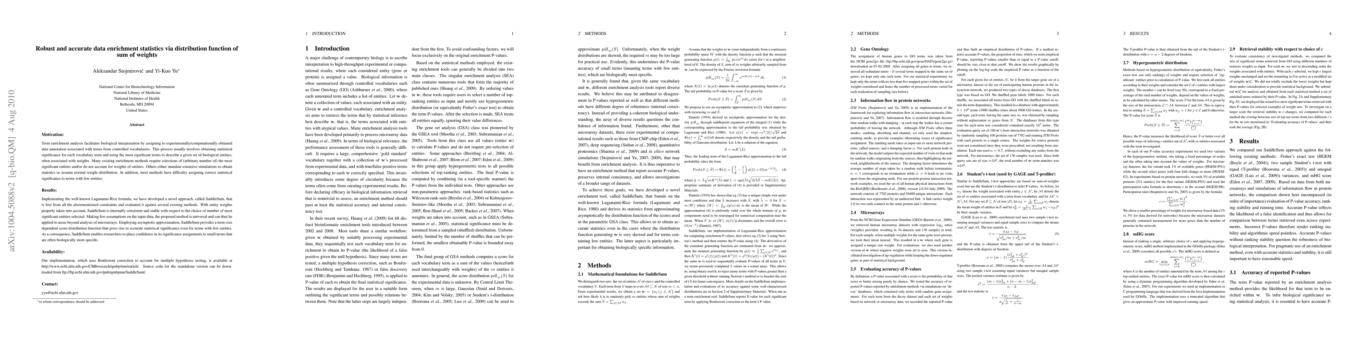 Term enrichment analysis facilitates biological interpretation by assigning to experimentally/computationally obtained data annotation associated with terms from controlled vocabularies. This process usually involves obtaining statistical significance for each vocabulary term and using the most significant terms to describe a given set of biological entities, often associated with weights. Many existing enrichment methods require selections of (arbitrary number of) the most significant entities and/or do not account for weights of entities. Others either mandate extensive simulations to obtain statistics or assume normal weight distribution. In addition, most methods have difficulty assigning correct statistical significance to terms with few entities. Implementing the well-known Lugananni-Rice formula, we have developed a novel approach, called SaddleSum, that is free from all the aforementioned constraints and evaluated it against several existing methods. With entity weights properly taken into account, SaddleSum is internally consistent and stable with respect to the choice of number of most significant entities selected. Making few assumptions on the input data, the proposed method is universal and can thus be applied to areas beyond analysis of microarrays. Employing asymptotic approximation, SaddleSum provides a term-size dependent score distribution function that gives rise to accurate statistical significance even for terms with few entities. As a consequence, SaddleSum enables researchers to place confidence in its significance assignments to small terms that are often biologically most specific.