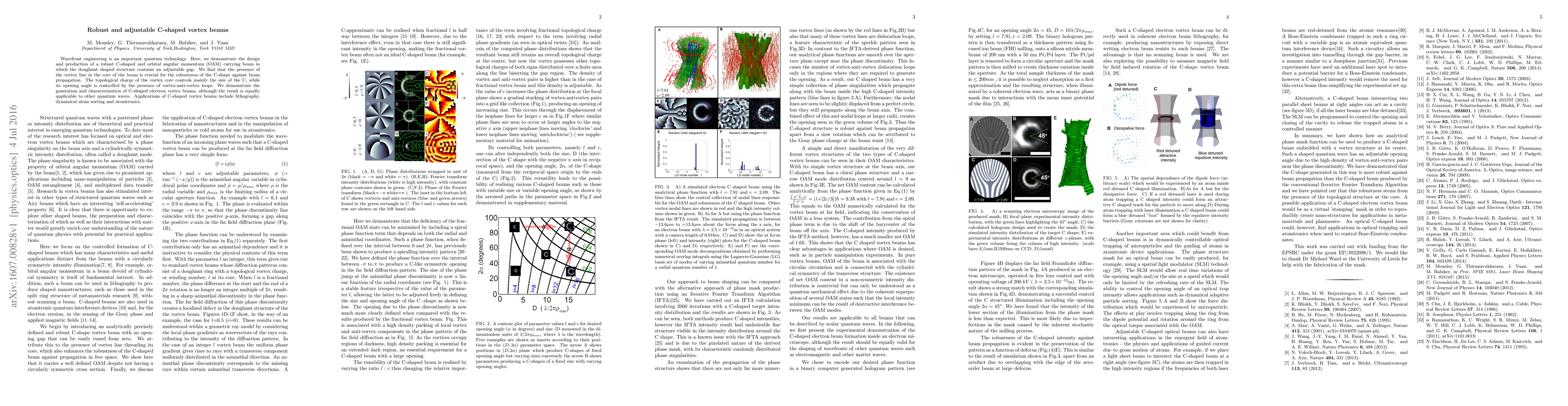 Wavefront engineering is an important quantum technology. Here, we demonstrate the design and production of a robust C-shaped and orbital angular momentum (OAM) carrying beam in which the doughnut shaped structure contains an adjustable gap. We find that the presence of the vortex line in the core of the beam is crucial for the robustness of the C-shape against beam propagation. The topological charge of the vortex core controls mainly the size of the C, while its opening angle is controlled by the presence of vortex-anti-vortex loops. We demonstrate the generation and characterisation of C-shaped electron vortex beams, although the result is equally applicable to other quantum waves. Applications of C-shaped vortex beams include lithography, dynamical atom sorting and atomtronics.