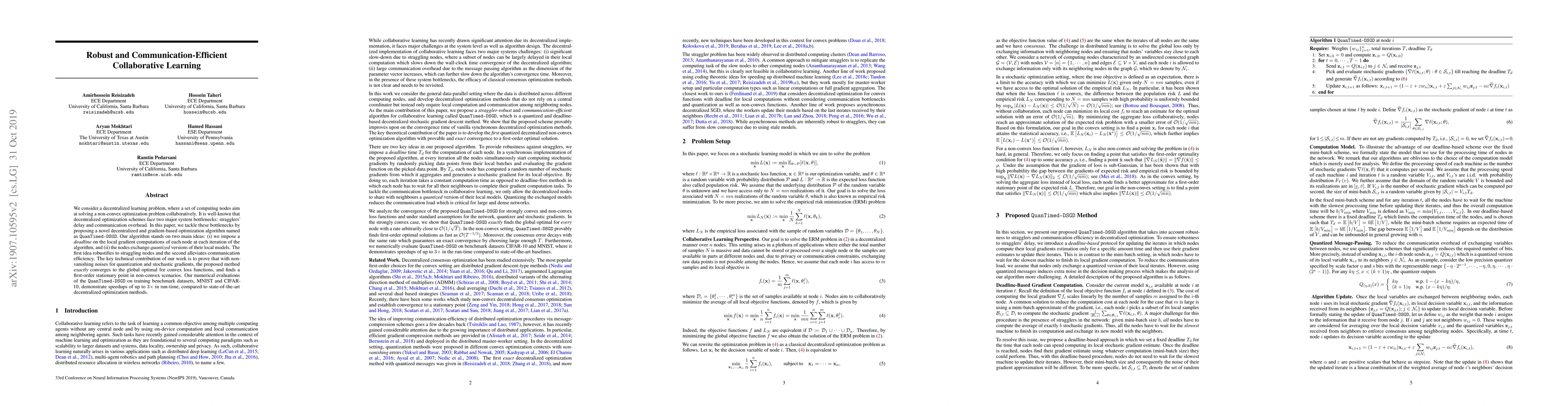 We consider a decentralized learning problem, where a set of computing nodes aim at solving a non-convex optimization problem collaboratively. It is well-known that decentralized optimization schemes face two major system bottlenecks: stragglers' delay and communication overhead. In this paper, we tackle these bottlenecks by proposing a novel decentralized and gradient-based optimization algorithm named as QuanTimed-DSGD. Our algorithm stands on two main ideas: (i) we impose a deadline on the local gradient computations of each node at each iteration of the algorithm, and (ii) the nodes exchange quantized versions of their local models. The first idea robustifies to straggling nodes and the second alleviates communication efficiency. The key technical contribution of our work is to prove that with non-vanishing noises for quantization and stochastic gradients, the proposed method exactly converges to the global optimal for convex loss functions, and finds a first-order stationary point in non-convex scenarios. Our numerical evaluations of the QuanTimed-DSGD on training benchmark datasets, MNIST and CIFAR-10, demonstrate speedups of up to 3x in run-time, compared to state-of-the-art decentralized optimization methods.