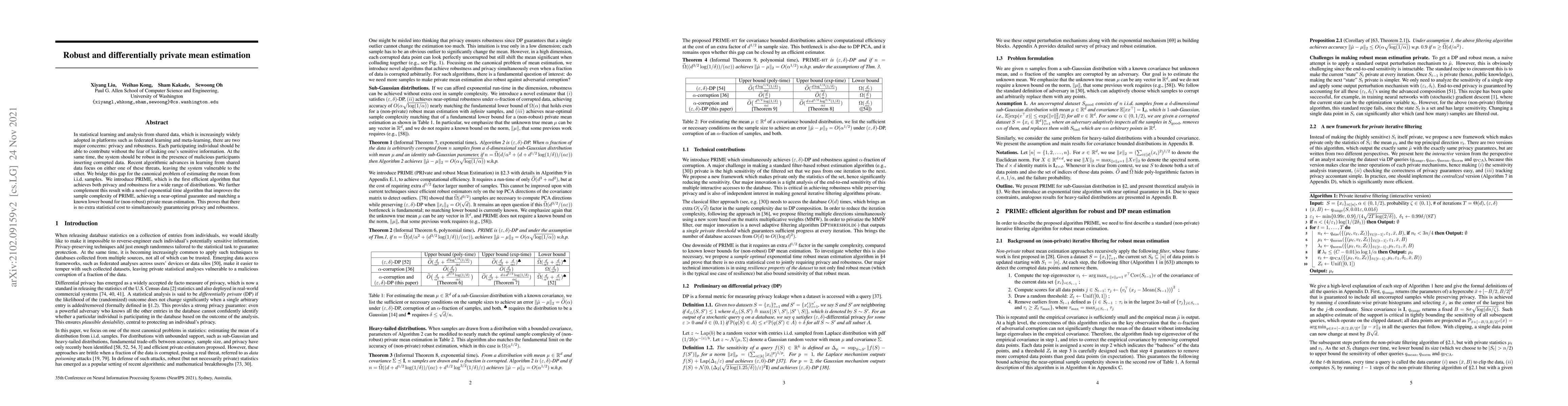 This paper introduces PRIME, an efficient algorithm for estimating the mean from i.i.d. samples while ensuring both privacy and robustness against malicious data. The authors also present an exponential time algorithm that nearly optimizes sample complexity, demonstrating no additional statistical cost for achieving both privacy and robustness.