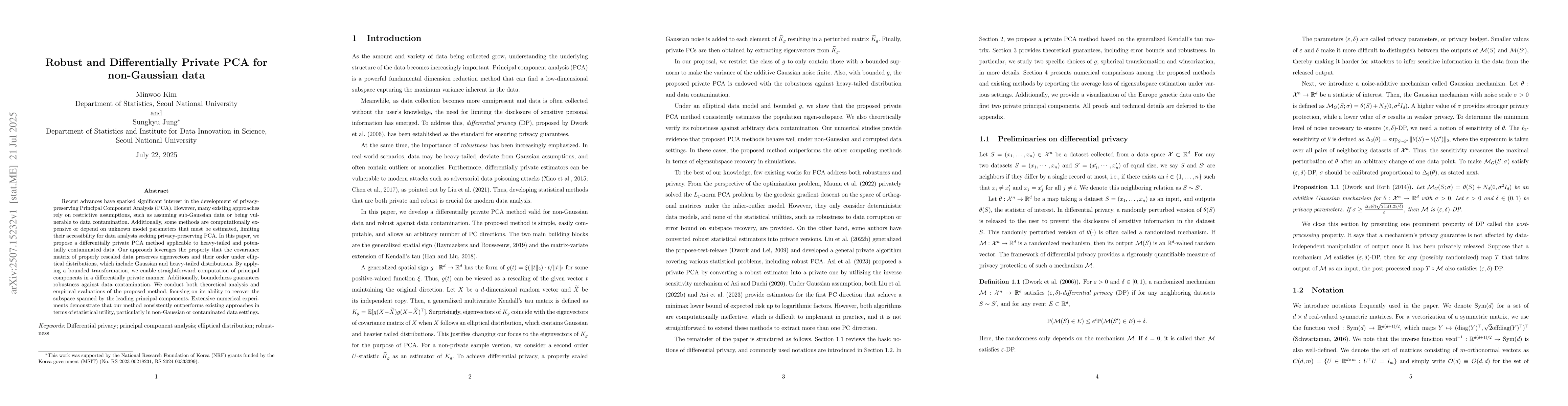 Recent advances have sparked significant interest in the development of privacy-preserving Principal Component Analysis (PCA). However, many existing approaches rely on restrictive assumptions, such as assuming sub-Gaussian data or being vulnerable to data contamination. Additionally, some methods are computationally expensive or depend on unknown model parameters that must be estimated, limiting their accessibility for data analysts seeking privacy-preserving PCA. In this paper, we propose a differentially private PCA method applicable to heavy-tailed and potentially contaminated data. Our approach leverages the property that the covariance matrix of properly rescaled data preserves eigenvectors and their order under elliptical distributions, which include Gaussian and heavy-tailed distributions. By applying a bounded transformation, we enable straightforward computation of principal components in a differentially private manner. Additionally, boundedness guarantees robustness against data contamination. We conduct both theoretical analysis and empirical evaluations of the proposed method, focusing on its ability to recover the subspace spanned by the leading principal components. Extensive numerical experiments demonstrate that our method consistently outperforms existing approaches in terms of statistical utility, particularly in non-Gaussian or contaminated data settings.