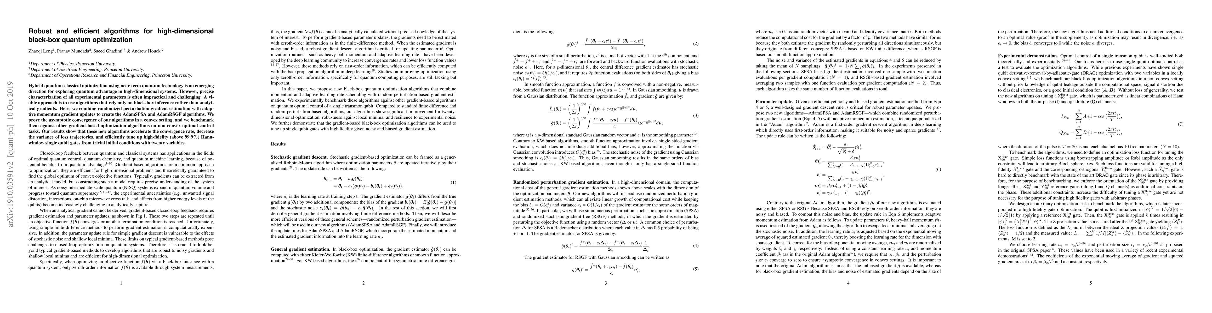 This research introduces AdamSPSA and AdamRSGF, novel algorithms that leverage black-box inference for high-dimensional quantum optimization, proving their asymmetric convergence in convex settings and demonstrating superior performance in non-convex tasks. These algorithms efficiently tune high-fidelity single-qubit gates with reduced variance in loss trajectories.