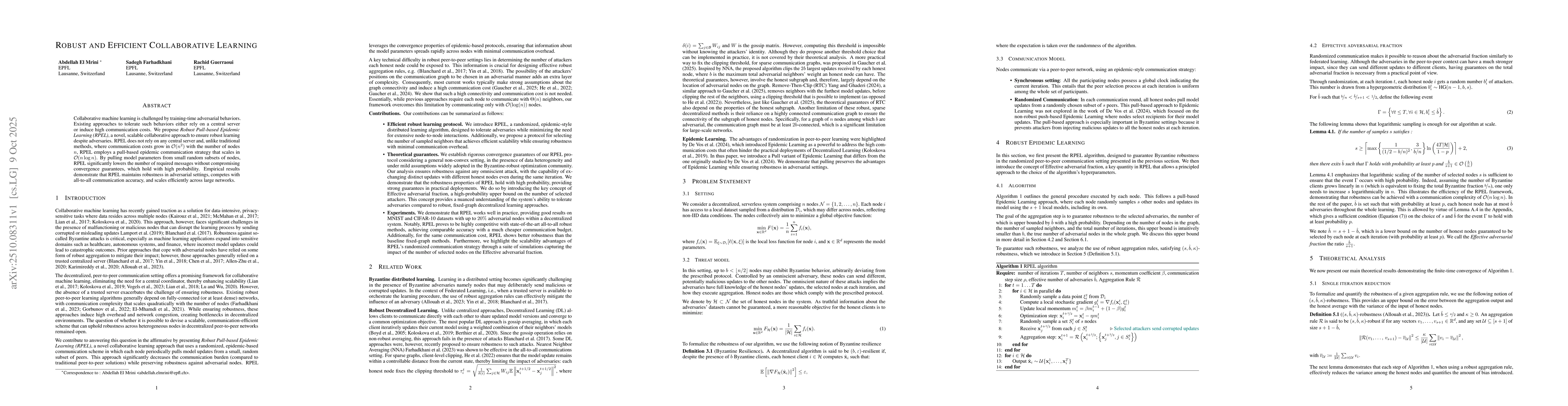 Collaborative machine learning is challenged by training-time adversarial behaviors. Existing approaches to tolerate such behaviors either rely on a central server or induce high communication costs. We propose Robust Pull-based Epidemic Learning (RPEL), a novel, scalable collaborative approach to ensure robust learning despite adversaries. RPEL does not rely on any central server and, unlike traditional methods, where communication costs grow in $\mathcal{O}(n^2)$ with the number of nodes $n$, RPEL employs a pull-based epidemic-based communication strategy that scales in $\mathcal{O}(n \log n)$. By pulling model parameters from small random subsets of nodes, RPEL significantly lowers the number of required messages without compromising convergence guarantees, which hold with high probability. Empirical results demonstrate that RPEL maintains robustness in adversarial settings, competes with all-to-all communication accuracy, and scales efficiently across large networks.